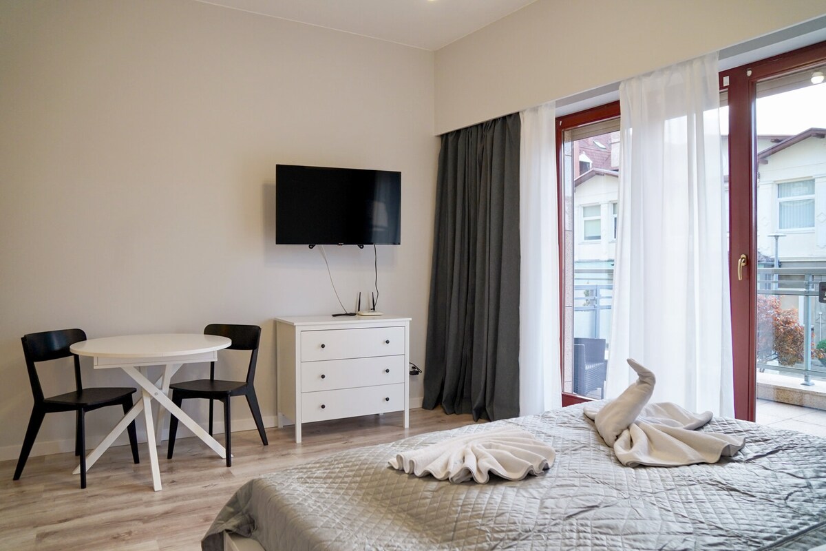 Tiešs skats uz ūdeni: mājīgs retro stila dzīvoklis ar lielu balkonu, 600 m attālumā no pludmales un centra. Gultasveļa, dvieļi un pēdējā uzkopšana iekļauta kopējā cenā. Ideāli piemērots ģimenēm. Iekštelpu peldbaseins un pirts mājā. Iekļauti divi pārgājienu velosipēdi bez maksas Tūrisma nodoklis 3 PLN apmērā par nakti tiek maksāts uz vietas.