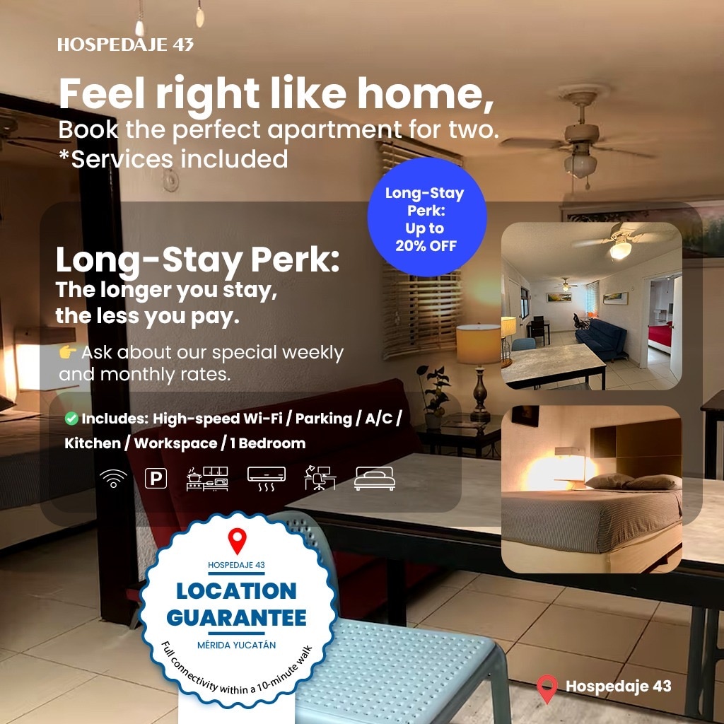 Tīrs dzīvoklis, kluss mājoklis diviem viesiem. Tajā ir televizors, virtuvīte, mini bārs, mikroviļņu krāsns, elektriskā plīts, kafijas automāts, trauki, glāzes. Ērta un plaša koplietošanas terase. Tikai 20 minūtes ar kravas automašīnu līdz Paseo de Montejo galvenajai avēnijai, kravas automašīna iet 8 metru attālumā no dzīvokļa. Netālu atrodas arī OXXO pamata bērnudārzs 5 minūšu gājiena attālumā un 10 minūšu gājiena attālumā no Super Soriana un 15 minūšu brauciena attālumā ar kravas automašīnu līdz Altabrisa iepirkšanās laukumam.