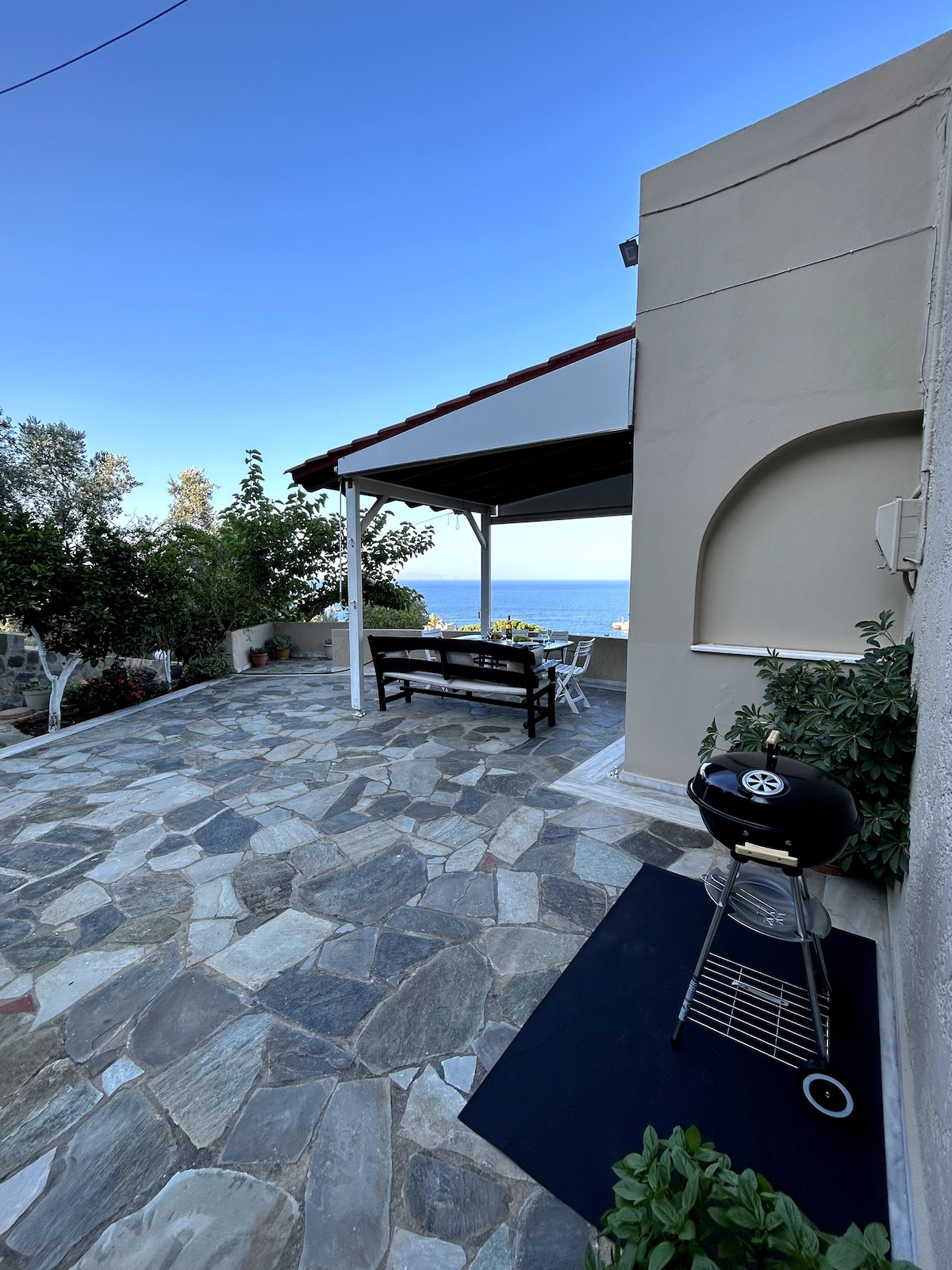 Welcome to OUR HOME with an unlimited view of the Mediterranean blue, at the outskirts of the Heraklion city. It is a villa, offering a basketball court, 4 bedrooms (with A/C), 2 bathrooms, and 2 working spaces. It is surrounded by a garden with flowers and trees. There is an eastern orientation that gives you the opportunity to admire the colors of the sky and the sea when the sun rises. Our primary duty is the famous Cretan Hospitality. Availability for long-term booking upon request.