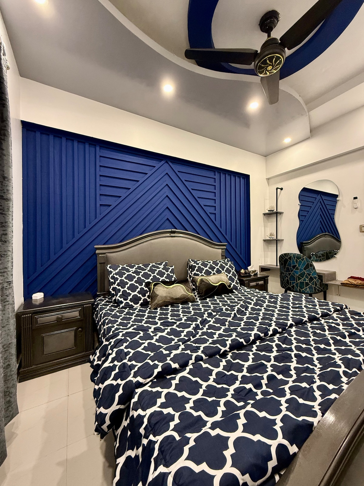 Enjoy this bright, colorful studio in a new building of DHA Phase VI (Small Bukhari) at 2nd floor (without lift). Watch Netflix & YouTube on the smart projector in bed 🎥, or enjoy movies with the LED in the living room 📺. Chill on the velvet sofa 💺, cook in the modern kitchen 🍳, and dine under the arc lamp beside a lovely painting 🎨. Two bathrooms 🚿 mean no waiting. Modern, stylish, and super comfy ✨