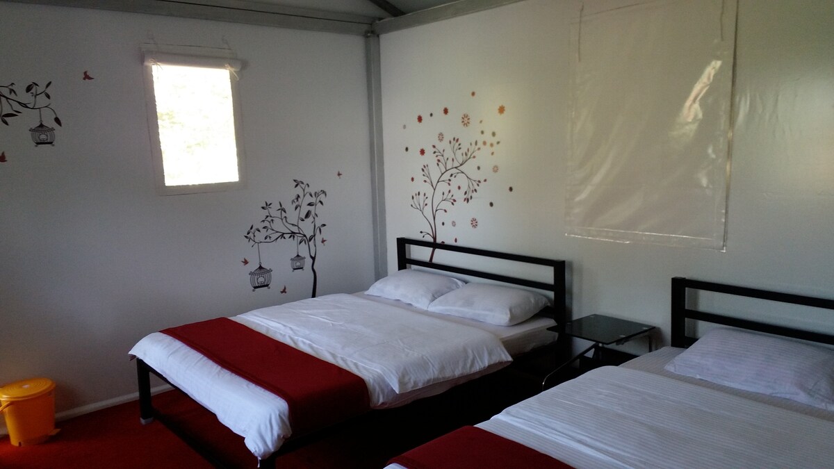 ♣Experience the thrill of camping in our Jungle Safari Tent located within 2 acres of coffee estates. ♣Perfect for families, the tent can accommodate up to 5 guests and has a private washroom. ♣Enjoy complimentary meals and activities such as hillside trekking, jeep rides to private streams and dam backwaters, coffee plantation tours, nature walks, bonfires, cycling, and bird watching. ♣Guests have access to the shared outdoor dining area, patio, and outdoor furniture at the Coffeebean Villa.