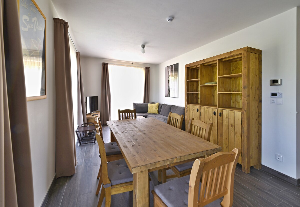 Luksusa kalnu apartamenti ar 3+kk (67,6 m2) ar terasi (31,1 m2) un garāžas stāvvietu atrodas Rezidences Jelení boudy pirmajā stāvā. Apartamenti ir paredzēti 4 līdz 6 personām. Jūs šeit atradīsiet divas guļamistabas, dzīvojamo istabu (ar izvelkamu dīvānu) ar virtuves un ēdamzonu, vannasistabu un tualeti. Pie mājas atrodas āra rotaļu laukums bērniem.