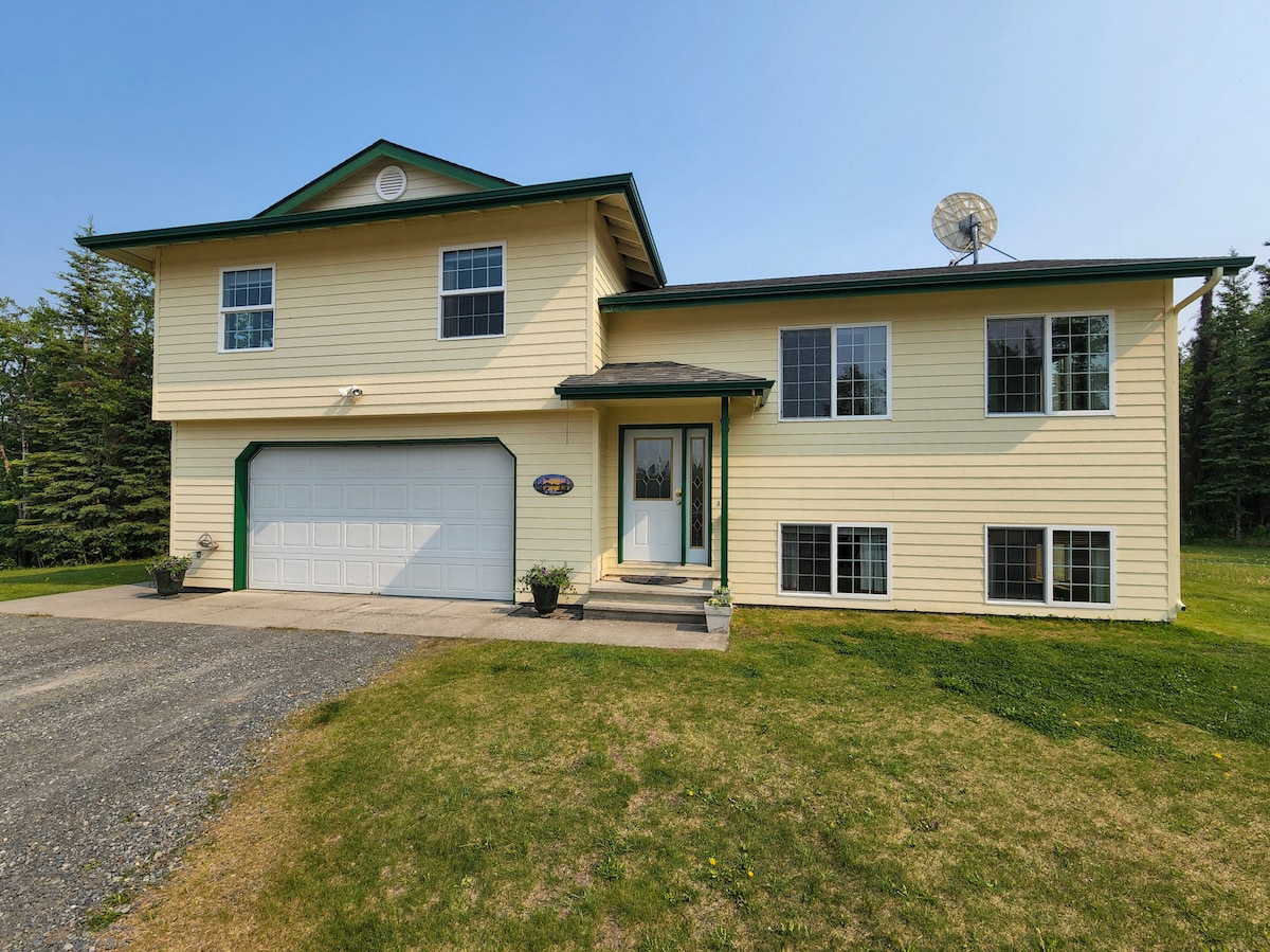 2 guļamistabu 1 vannasistabas viesu nams ērti guļ 5-7. Ģimenes cenas ir pieejamas pēc informācijas pieprasījuma, ja mazāki bērni vai ģimenes mājokļi rezervē mājokli, kas var viegli gulēt vairāk. Lieliska atrašanās vieta tieši pie Kenai upes. Apkārt ir daudz koku, taču 2 jūdžu attālumā no pilsētas. Lieliski skati un kopīgas āra papildērtības. Bērnu rāvējslēdzējs, nindzju līnija, mazu bērnu šūpoles, rotaļu laukums un daudz kas cits. Liela atpūta, vakariņas, izklaidējošas terases. 4 ugunskura vietas. Piestātne un terase pie upes, kur makšķerēt visu dienu un nakti. Saimnieki Aļaskā.