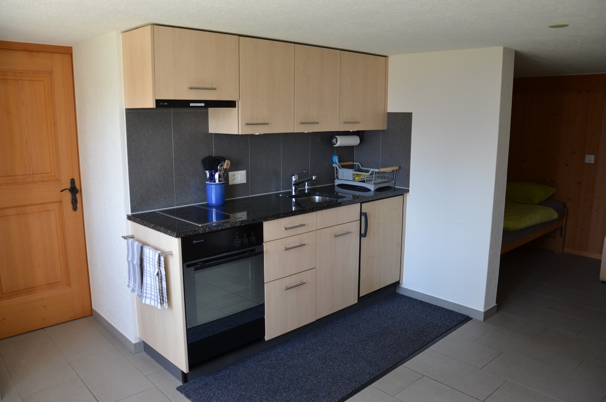 Gaiša, mājīga vienistabas studija divu ģimeņu mājas pirmajā stāvā ar atsevišķu ieeju ļoti klusā un saulainā vietā. No studijas paveras unikāls panorāmas skats uz aizraujošajiem Bernes Alpiem. Studijā ir divas vienguļamās gultas (kuras var salikt kopā, lai izveidotu divguļamo gultu). Swisscom TV un radio, Wi-Fi, minivirtuve ar cepeškrāsni, keramikas plīts virsma un duša/WC. Ir pieejama privāta autostāvvieta. Mūsu karsto ūdeni un elektrību nodrošina saules sistēma. Ērika un Renē