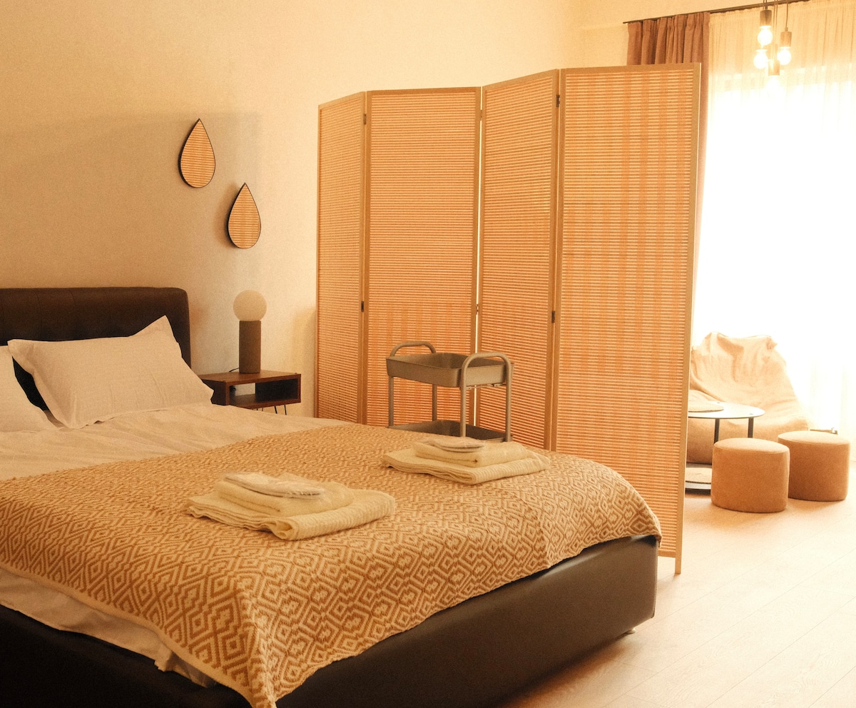 Kick back and relax in this calm, stylish space. This guesthouse is run by Gocha and his wife Nino, a warm and creative couple known for their hospitality. Gocha is highly skilled in crafting, and the entire home is decorated with unique handmade pieces, created by him. Every detail has its own story and adds character to the space. One of the most unforgettable features? A small cable-car food delivery that brings meals directly to the terrace — a charming touch guests always remember.
