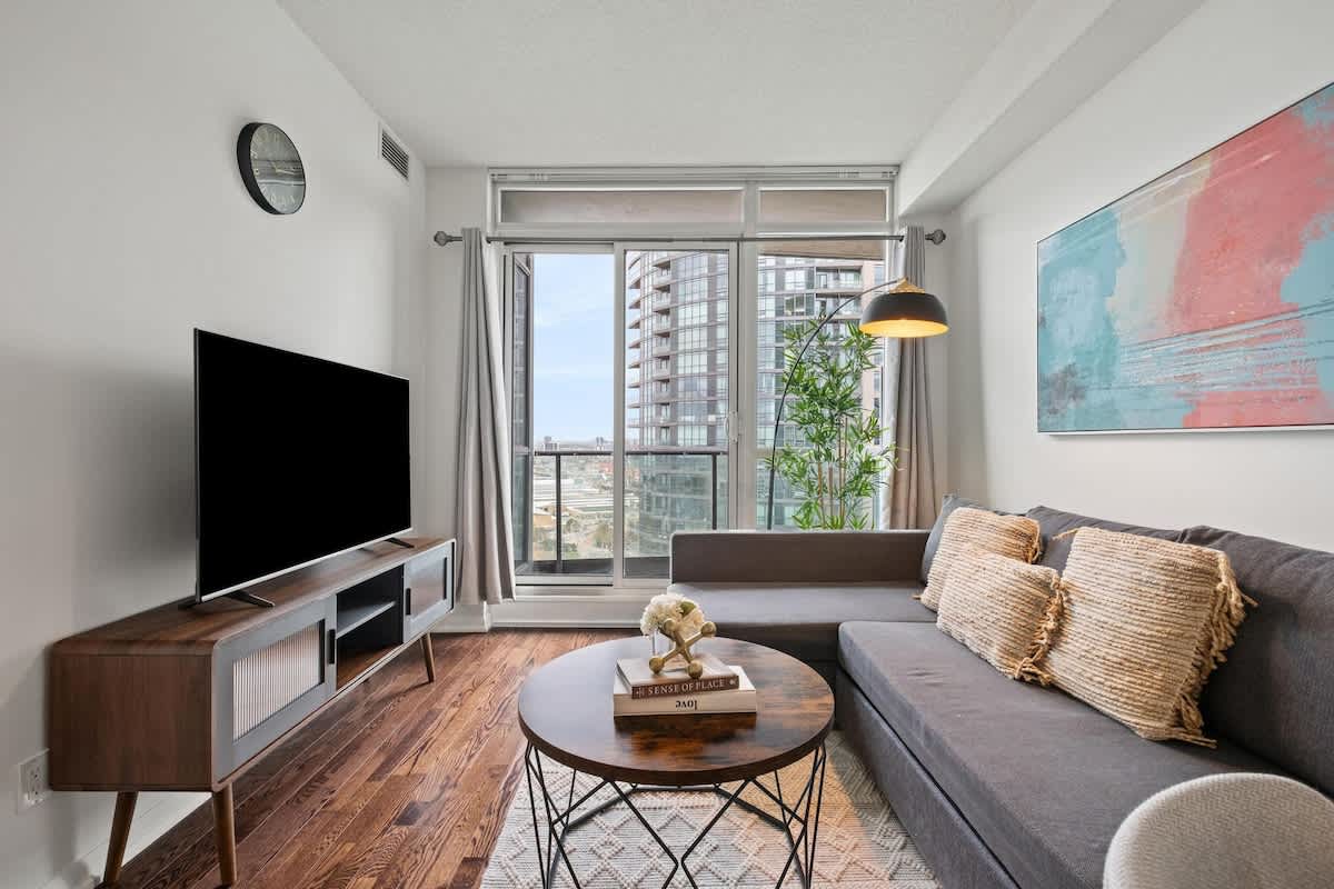 Laipni lūdzam Fort York Flat! Šī 2 guļamistabu, 1 vannasistabas telpa ir pārdomāti atjaunota, izmantojot modernu un mūsdienīgu dekoru sajaukumu, lai radītu relaksējošu, modernu vietu, kur atpūsties, baudot visu, ko piedāvā Toronto centrs. Mūsu atrašanās vieta un viedā aizslēdzamā kastīte, kas atrodas pie ārdurvīm, atvieglo reģistrēšanos dzīvoklī nekā jebkad agrāk. Nav jāuztraucas par satraukumu ar reģistratūras darbiniekiem vai liftu gaidīšanu.
