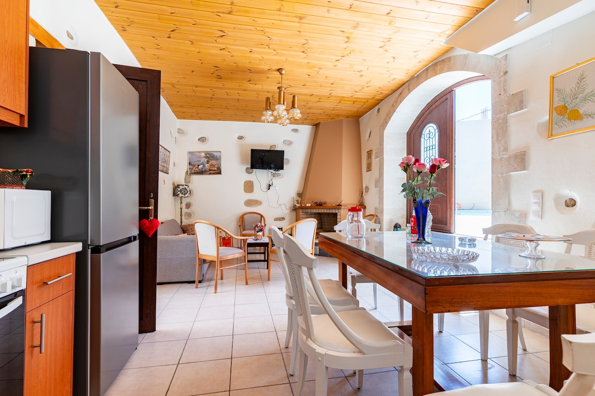 Pilnībā atjaunota, akmeņaina ēka, kas uzbūvēta uz trīs senām grieķu alām. Kādreiz tā bija Venēcijas olīvu spiedes rūpnīca. Tagad tas ir mūsdienīgs brīvdienu mājoklis ar diviem baseiniem (iekštelpu un āra) un bioloģisku dārzeņu un vietējo augļu dārzu