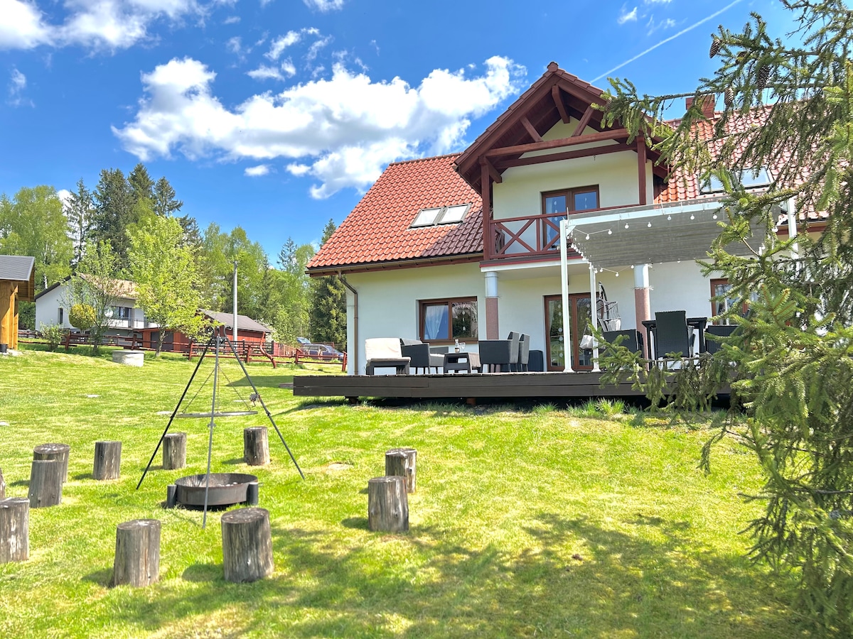 Aicinām jūs uz skaistu koka māju ar āra stikla pirti ar skatu uz mežu un burbuļvannu, kur varat atjaunoties. (Piezīme: ziemā saaukstēšanās gadījumā mēs paturam iespēju uz laiku izslēgt burbuļvannu no lietošanas). Mājā 3 guļamistabas, pilnībā aprīkota virtuve, 2 vannasistabas. Ziemā mēs piedāvājam 2 foršas slēpošanas trases tuvumā: Zagroń un Golden Groń. Un lielisks slēpošanas kūrorts Ščirkā atrodas 45 minūšu attālumā. SVARĪGI: Drošības apsvērumu dēļ ieteicams ziemā ņemt līdzi ķēdes.