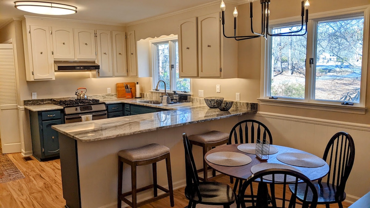 Māja ir gatava Ziemassvētkiem ar eglīti – izbaudiet lauku klusumu mājās prom no mājām – radiet svētku atmiņas kopā ar mīļajiem – pēc pieprasījuma – dekorācijas var pagarināt līdz janvārim vēlākai svinēšanai. Šī lieliskā māja ar 3 guļamistabām/2 vannas istabām ir pilna ar raksturu, bezmaksas autostāvvietu un ātru Wi-Fi, un tā atrodas drošā, bet klusā strupceļā, tikai 10 minūšu brauciena attālumā no veikaliem, pārtikas veikaliem un restorāniem Knightdale - 17 minūšu brauciena attālumā no Raleigh centra vai Mid-Town North Hills. 2 lielas slimnīcas atrodas 10/12 minūšu attālumā.
