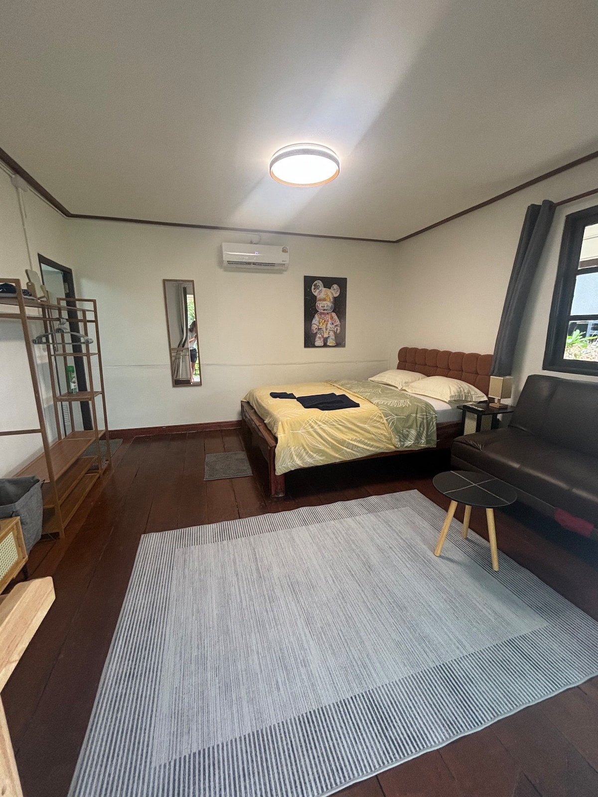 Calm hillside bungalow in Kai Bae with jungle, mountain and distant sea views. From your private terrace you look over tall palm trees, banana plants and a green valley, and on many days you can see elephants moving quietly below. The bungalow is next to the city above Kai Bae (5m walk) so you enjoy fresh air, birdsong and a peaceful atmosphere, while still being just a short scooter ride from the beach, cafés & shops. Inside, the space is comfortable, fully equipped with swimming pool access!