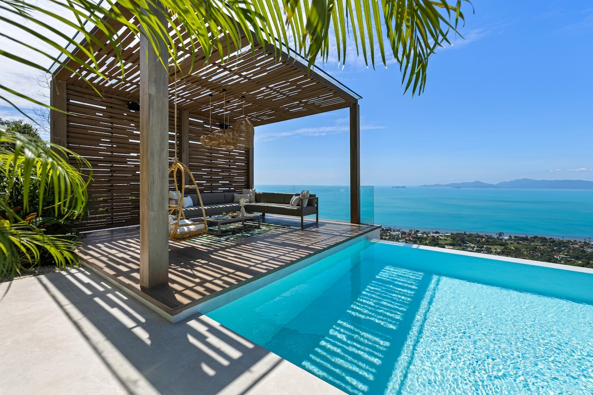 Panoramic sea & sunset views from every room. Private 12m infinity pool. Walk to private beach in 5 min. Gated luxury estate in Thongson Bay, Samui. 4 bedrooms ·3.5 baths ·up to 8 guests ★90' home cinema ★3 sea-view workspaces with monitors — ideal for remote work ★Treadmill, massage chair, trampoline ★Full kitchen with dishwasher, oven & coffee machine ★Outdoor shower ★Washer-dryer ·Gas BBQ ★Pool & garden maintenance included ★Beachfront estate pool + private beach access ★Free parking