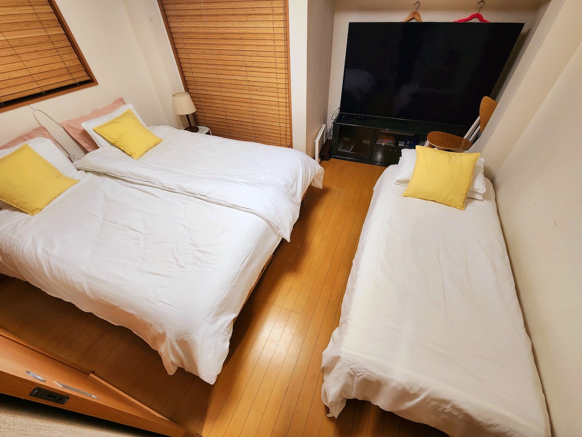 Paldies, ka skatījāties. Tas atrodas aptuveni 10-15 minūšu gājiena attālumā no Sanomijas stacijas. Lielekrāna televizors 65. izmēra televizorā. Jūs varat skatīties YouTube, Netflix utt. no izvēlnes pogas. Divas vienguļamās gultas, futoni un futoni var uzņemt līdz 3 personām. Ir pievienotas divas vienguļamās gultas. Tā ir liela gulta, kuras augstums ir 200 cm × 200 cm. Vienai personai tiks nodrošināti atsevišķi futoni. Nomainiet futona pārvalku, spilvendrānu, spilvena pārvalku, gultasveļu un visus pārvalkus. Mēs nodrošināsim 1 vannas dvieli un 1 sejas dvieli, taču, ja nepieciešams vairāk, dariet mums to zināmu iepriekš. Tuvumā ir daudz garšīgu un mājīgu restorānu. Jūs varat pasniegt kafiju un no rīta tuvumā esošā kafejnīcā. Bezmaksas autostāvvieta 1 Tā nav pieejama, ja tajā darbojas vairākas telpas, un to aptur citi klienti. Lūdzu, sazinieties ar mani iepriekš.