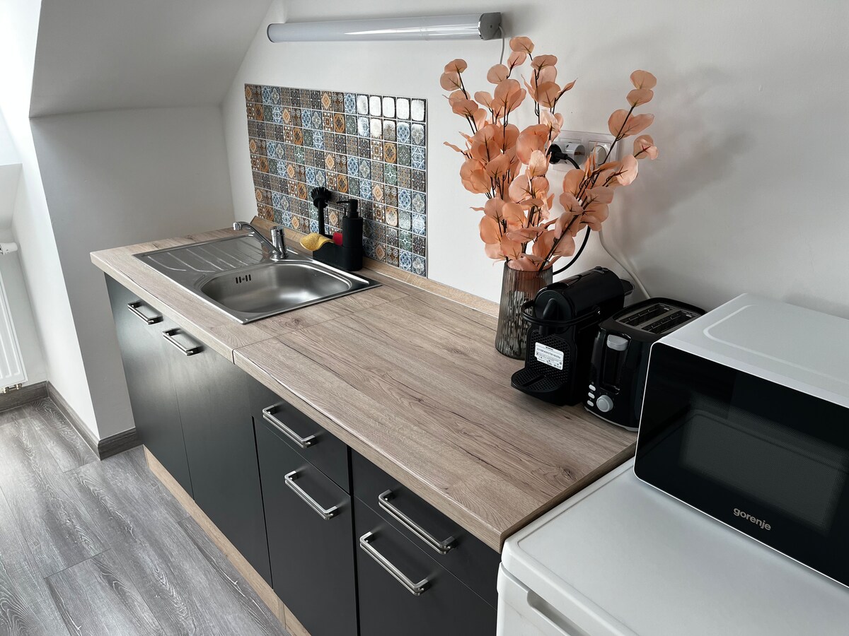 Es sveicu visus savā pilnībā renovētajā dzīvoklī netālu no pilsētas centra. Dzīvoklis piedāvā Netflix un Disney+ straumēšanas abonementus un Wi-Fi, lai atpūstos. Virtuve ir labi aprīkota, un to ir iespējams gatavot un cept. Pilsētas centrs atrodas aptuveni 10 minūšu gājiena attālumā. Tuvumā ir kafejnīca, maiznīca, konditoreja, pirmās nepieciešamības preču veikals, tabakas veikals, aptieka, veļas mazgātava, sporta autobusu pieturas un aptieka. To var ņemt līdzi, ja jums ir nepieciešams mīļdzīvnieks.