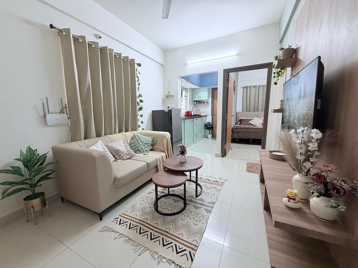 Šis pārdomāti iekārtotais bohēmas stila 1BHK dzīvoklis Hoodi, Bengaluru ir ideāli piemērots korporatīvajiem ceļotājiem, IT profesionāļiem, konsultantiem un ilgtermiņa viesiem. Telpas, kas veidotas zemes toņos un dekorētas ar nomierinošiem augiem, piedāvā mierpilnu, darbam piemērotu vidi ar uzticamu savienojumu. Dzīvoklis atrodas netālu no Whitefield IT Hub un tikai 20 minūšu attālumā no metro, nodrošinot ērtu piekļuvi birojiem un biznesa parkiem, kas ir ideāli piemēroti ilgstošiem darba uzdevumiem. Mājdzīvniekiem draudzīga vide.