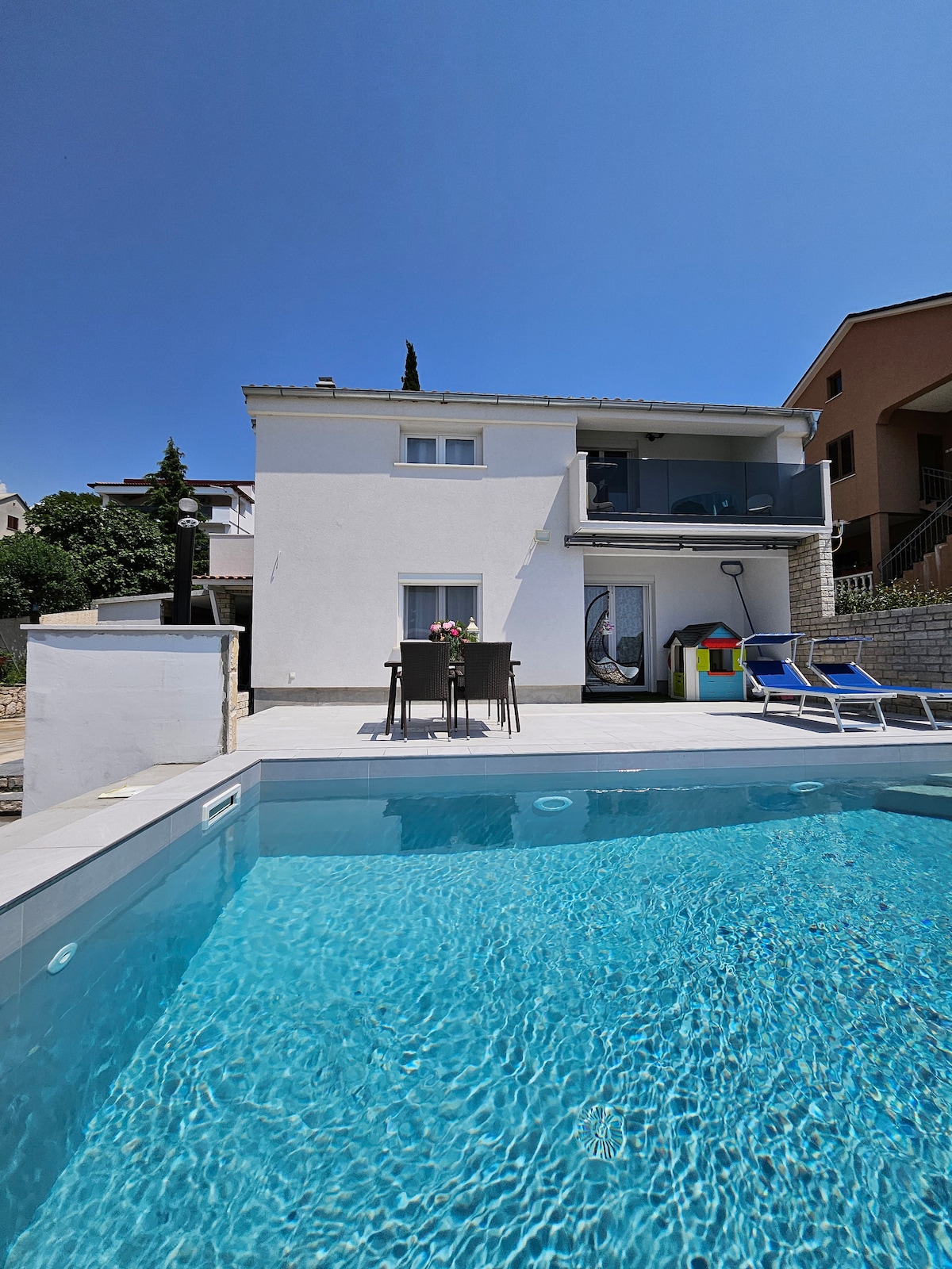 Mūsu sešu dzīvokļu brīvdienu māja kopā ar papildu aprīkojumu, piemēram, peldbaseinu, boulingu, bērnu rotaļu laukumu un pirti, piedāvā visu, kas nepieciešams atpūtai un patīkamai atpūtai. Mēs atrodamies Punat dienvidos, pludmale ir jūsu pirkstu galā (30 m attālumā)! Balkons - 20m2 Mūsu draudzīgais saimnieks Dino vienmēr būs jūsu rīcībā, lai saņemtu padomu un jebkādus jautājumus.