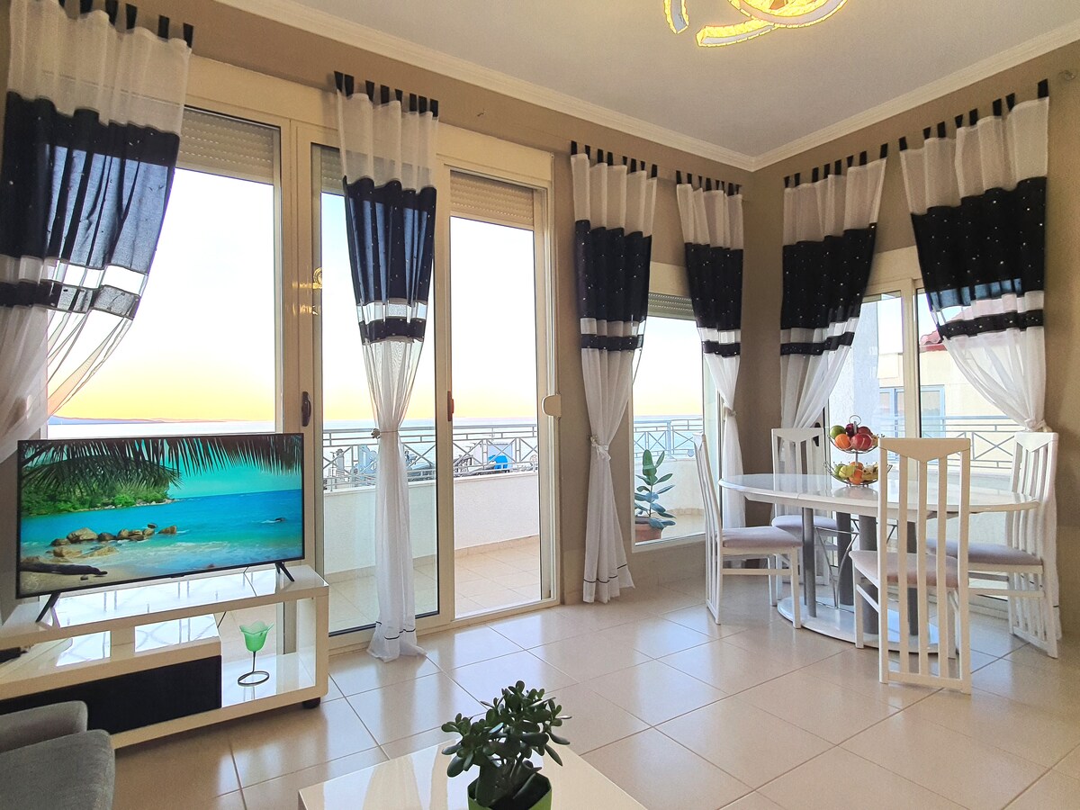 "Luxury Beachfront Oasis" aicina jūs uz sapņu mājokli Sarandā, no kura paveras nepārspējams skats uz jūru. Katra istaba šajā 65 kvadrātmetru dzīvoklī liecina par modernu greznību, kas paredzēta, lai jūs varētu mazgāt saules gaismā un mierā.