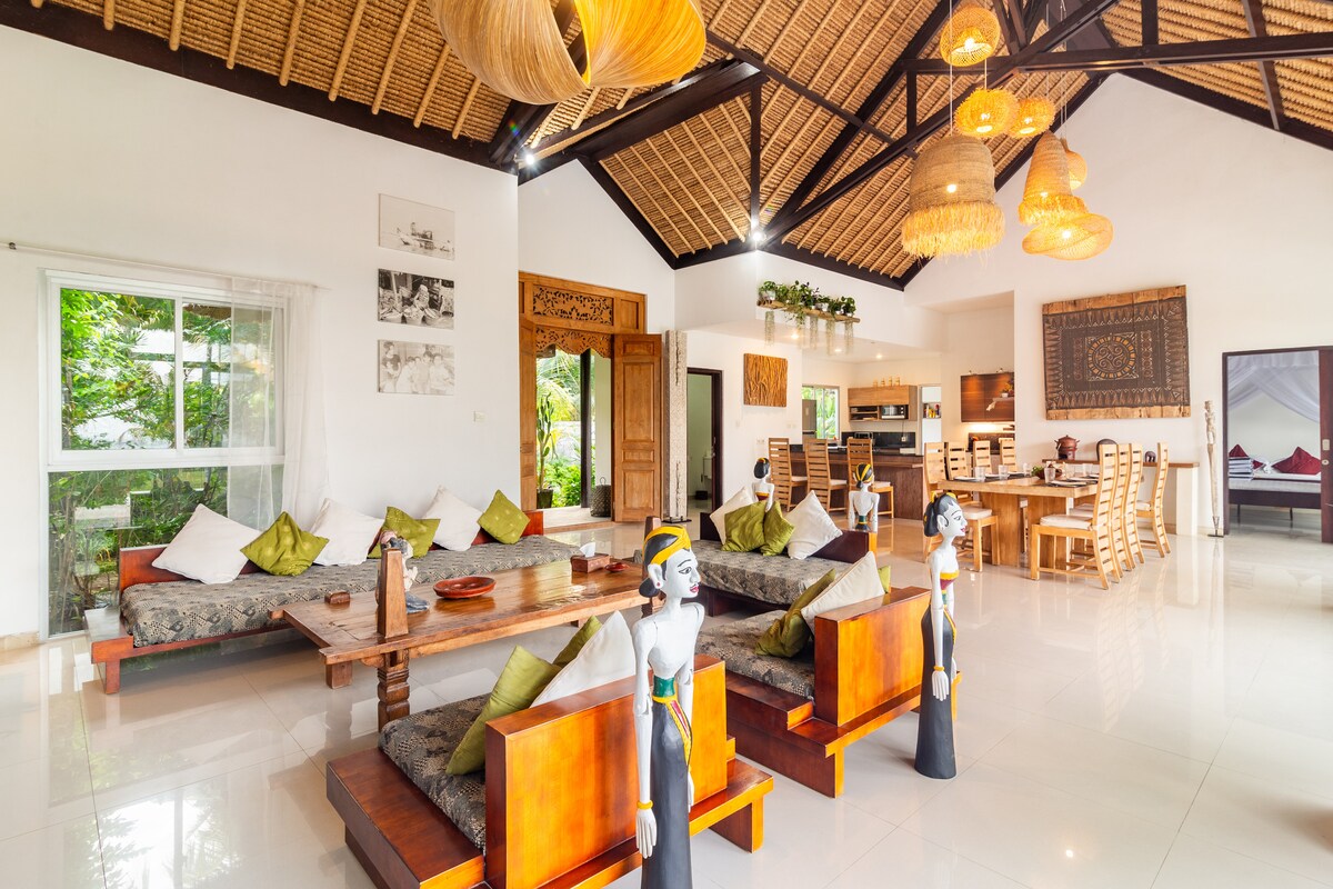 Jūsu pašu pludmales māja ar baseinu. Ideāli piemērots ģimenes atpūtai, kvalitatīvai laika pavadīšanai grupā vai romantiskai atpūtai. 3 guļamistabas ar gaisa kondicionētāju, 3 vannasistabas. Peldieties 10 metrus garā baseinā, ielēciet okeānā. Dažas no labākajām niršanas un snorkelēšanas vietām piekrastē tieši aiz vārtiem. Atlaidieties un atjaunojieties dažādās apburošās privātās telpās, nojumē ar spilveniem un lapenē, kā arī baseinā ar sauļošanās gultām un šūpuļtīkliem. Īpašnieks/šefpavārs ir slavens ar to, ka piedāvā labāko ēdienu Bali, kas tiek pasniegts jums okeāna krastā.