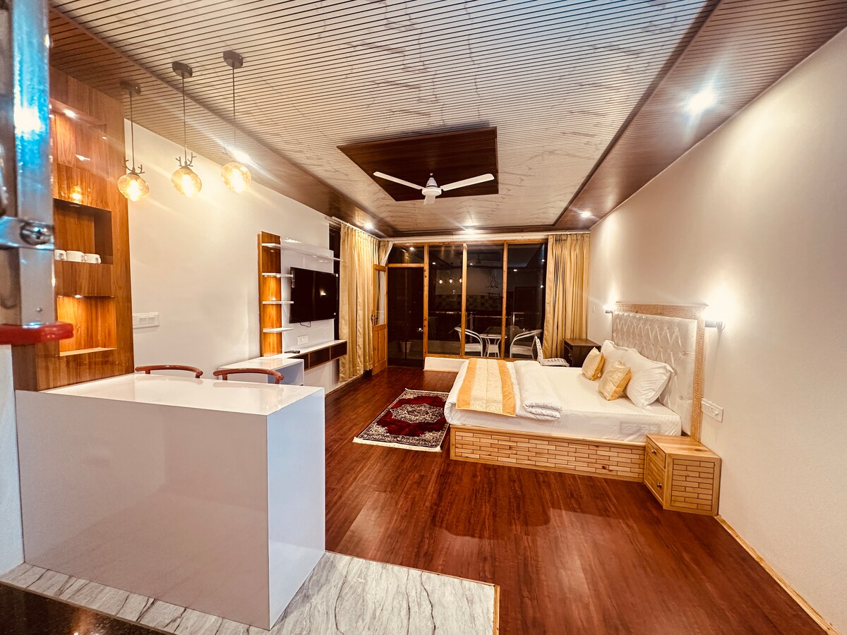 H₂O: Luxe by the River – luksusa studijas tipa dzīvokļi pie upes | Manali | 1./vidējais stāvs Satriecoši luksusa studijas tipa dzīvokļi blakus mierīgai upei ar elpu aizraujošu skatu uz kalniem. Silts koka interjers, akmens sienas, mīkstas gultas, elegants apgaismojums, stilīgs bārs un virtuvīte rada ideālu komforta un izsmalcinātības sajaukumu. Ideāli piemērots pāriem, medusmēneša baudītājiem un augstākās klases ceļotājiem, kas meklē mierpilnu, bet greznu atpūtu Manali.