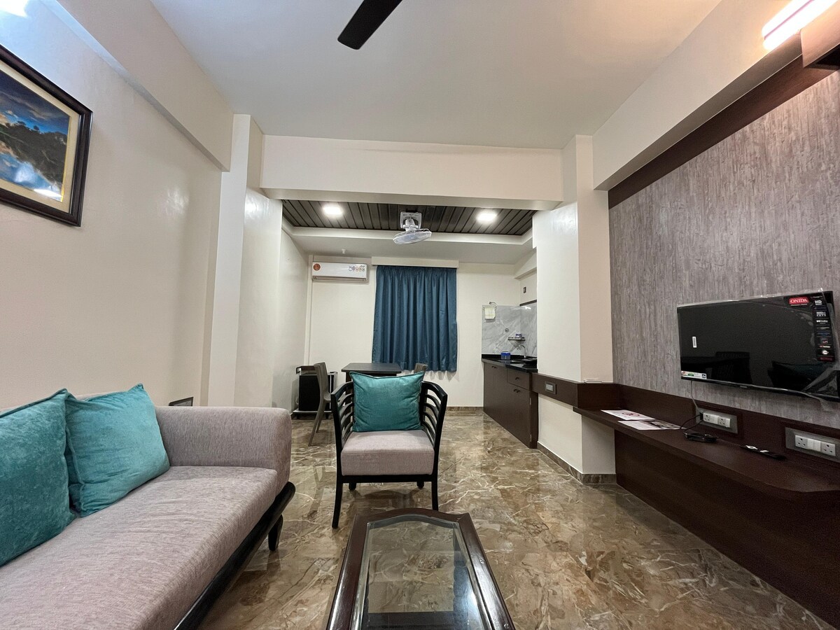 Experience the ultimate in luxury & Comfort at 'Varuna' studio unit. 305 Sq.ft unit of meticulously designed space,providing a perfect blend of style and functionality.This exquisite Suite comprises spacious AC Studio room with Pantry Kitchenette & Attached Toilet. Kingsize bed+single bed+chair. Common RO water purifier in lobby. It DOES NOT HAVE LIFT to access 1st floor. Reception & waiting area on G.floor+24hr Power backup+Carparking+close to pune-Hyd highway. 1 of the 4 Units by Kuber Suites.