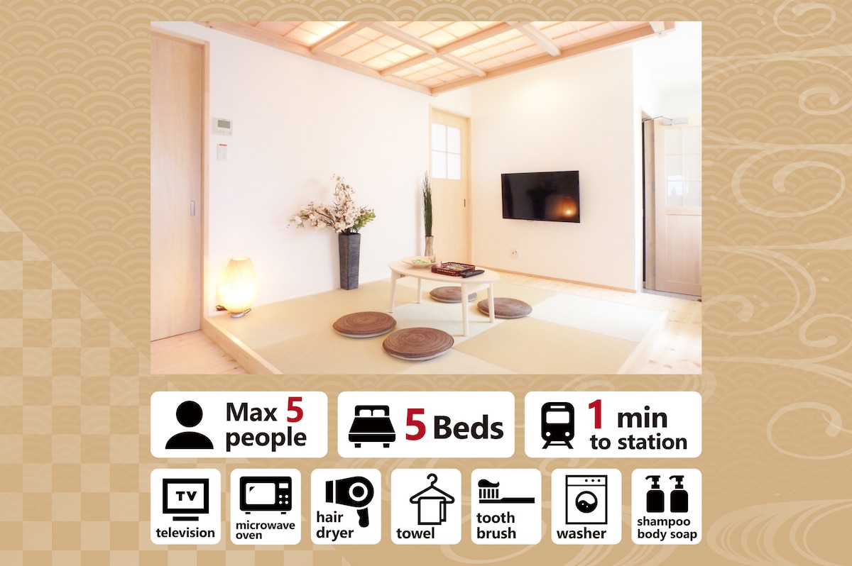 Šī ir viena no mūsu 11 dzīvokļu tipa naktsmītnēm. Tas atrodas aptuveni 15 minūšu gājiena attālumā no Kioto stacijas un 4 minūšu gājiena attālumā no Kintetsu Toji stacijas. Ļoti īsas pastaigas attālumā atrodas arī pilsētas autobusa pietura Kujo Omiya. Tuvumā atrodas arī Dzelzceļa muzejs un Kioto akvārijs. Tie tika atvērti 2016. gada aprīlī Umekouji parkā, kas ir tikai aptuveni 7 minūšu gājiena attālumā. No balkona paveras skats uz Pasaules mantojuma vietu - Toji tempļa piecu stāvu pagodu ("Goju no to").