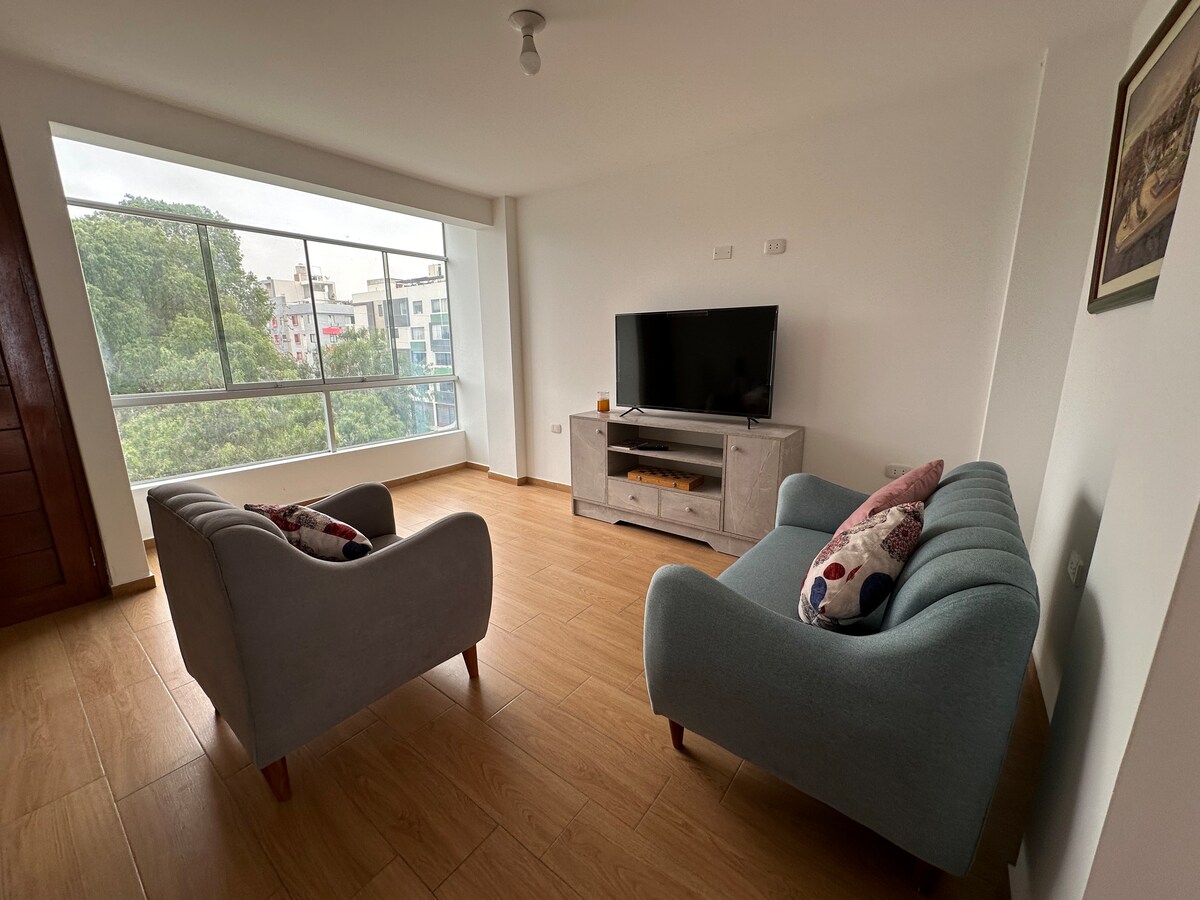 ✨Mājīgs dzīvoklis Trujillo✨ Izbaudiet klusu un mājīgu mājokli vienā no galvenajām avēnijām. Tikai 10 minūšu attālumā no Plaza de Armas un Mall Plaza, un tuvumā ir tirgi, restorāni, aptiekas un sporta zāles. Atrodas otrajā stāvā, drošā un ērtā vidē. Aprīkots ar visu nepieciešamo, lai justos kā mājās. Ideāli piemērots atpūtai pēc visu mūsu skaistā Trujillo tūrisma objektu apceļošanas.☀️🏖️💛