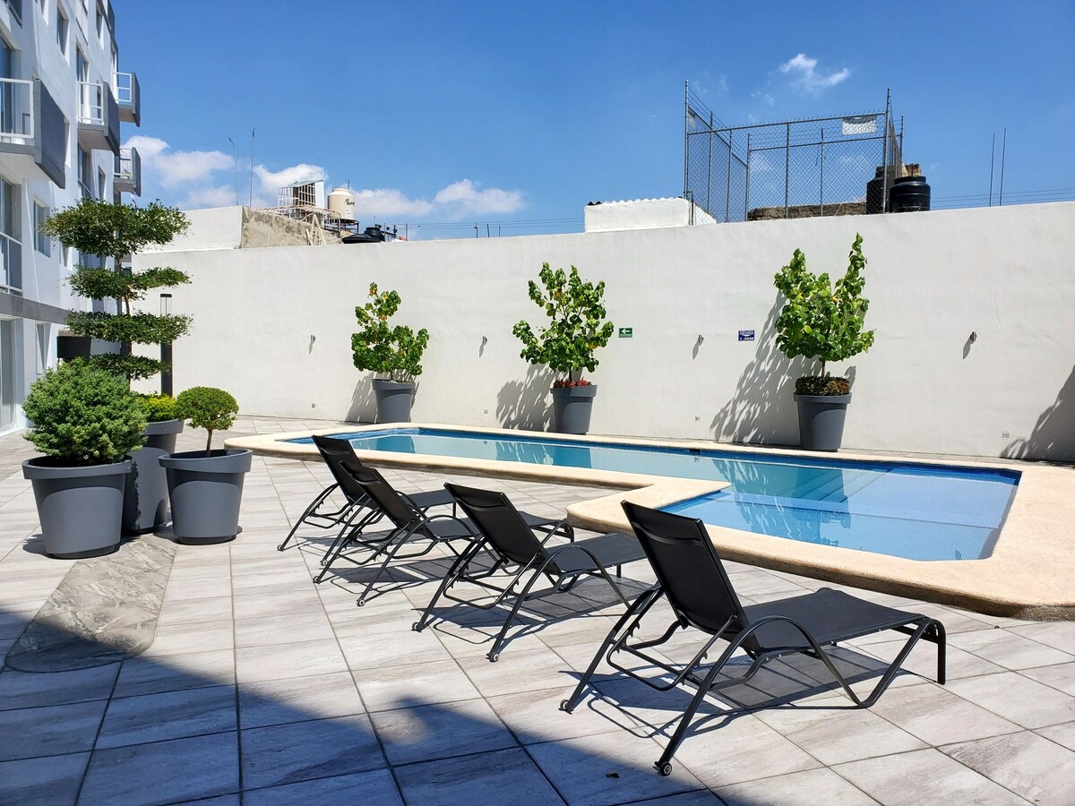 Céntrico y cómodo Departamento, A/C, Alberca y Gym