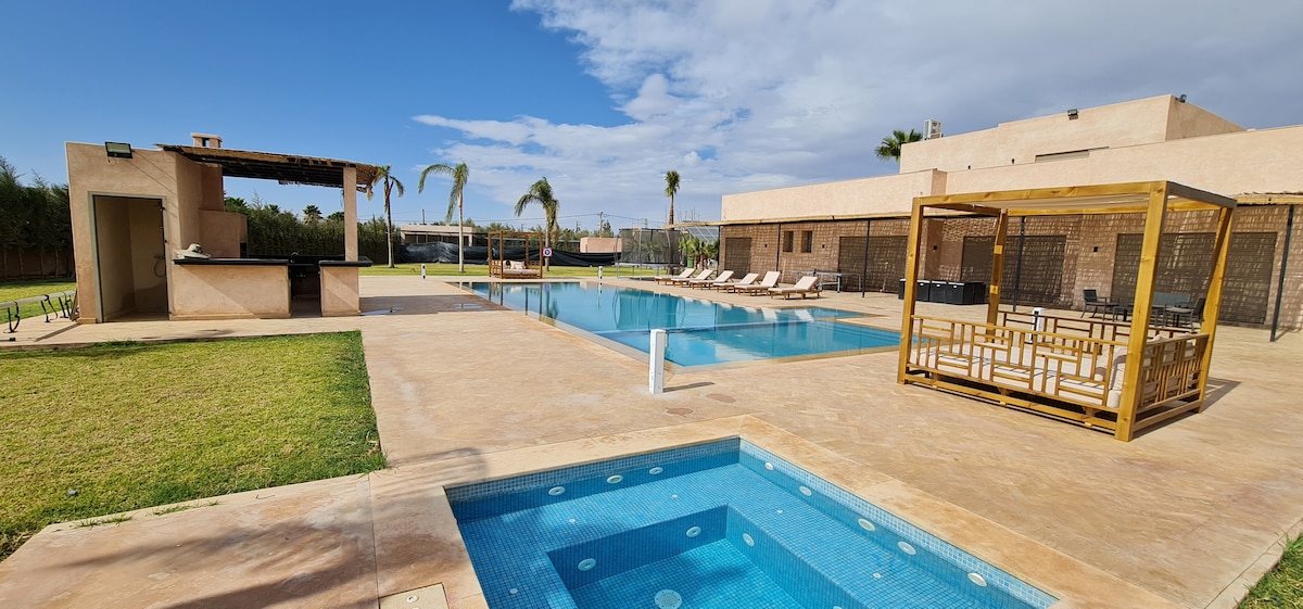 La villa des collines propose un cadre paisible calme et propice au dépaysement. elle se situe à 25 mins de Marrakech et 37 mins de Gueliz. Commerce de proximité ( boucherie, pharmacie fruit et legume local ) à 10 mins en voiture. Ping pong flechette coin foot-basket wifi coin télétravail sont à disposition Grande piscine non chauffée 2 suites+2 chb- deux coins sallon et cuisine ouverte - lit bebe- FAMILLE SEULEMENT- Pas de voisinage (maison voisine en construction) ss vis a vis