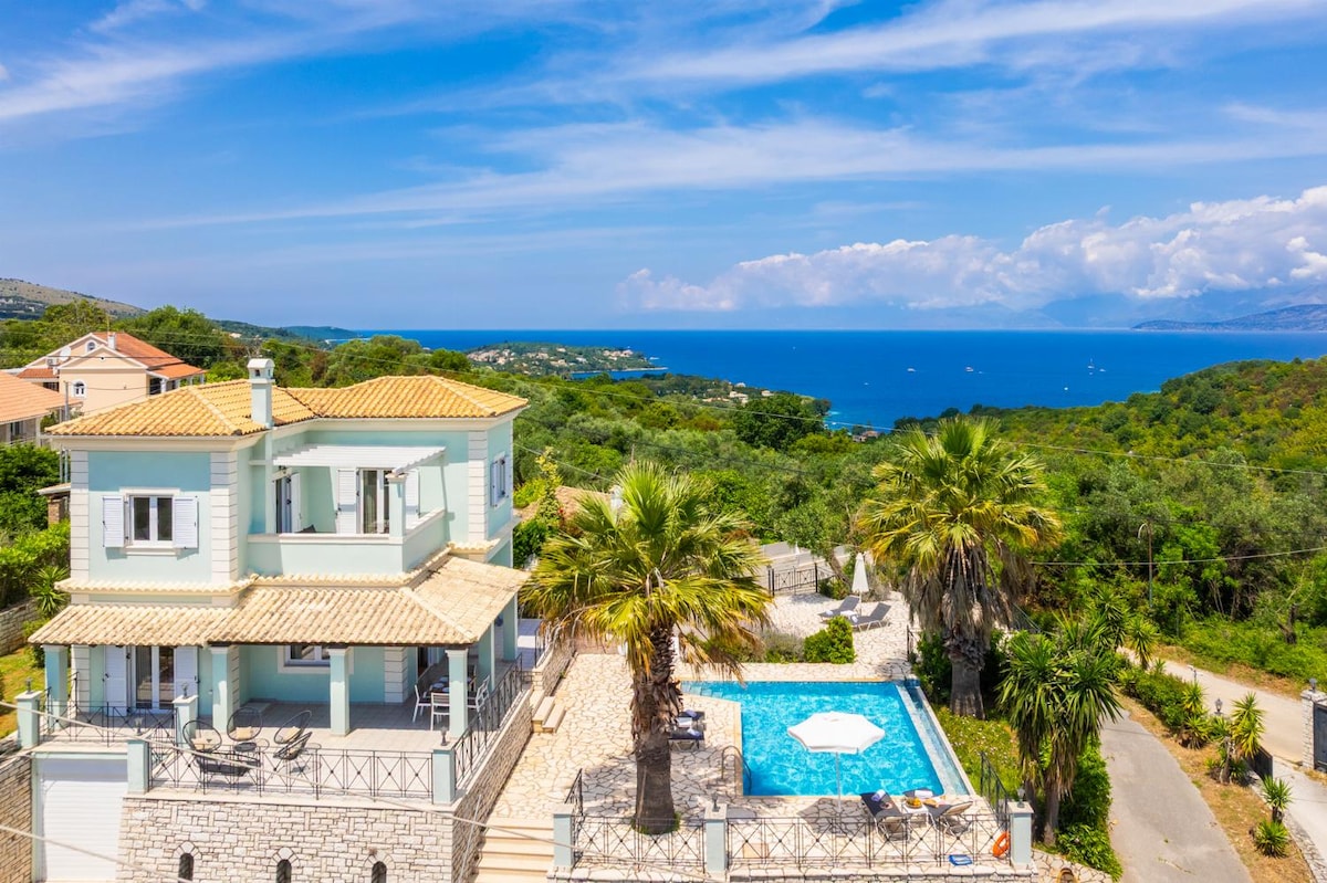 Villa atrodas augstu kalna nogāzē virs kvanta, bet stilīgā mazā zvejnieku ciemata Agios Stefanos. Augstā pozīcija sniedz elpu aizraujošu skatu, vēsu jūras vēsmu un greznu nošķirtību. Ir grūti sajust, ka šeit sēžot pusaudži, dzeriet rokā, jo debesis no zilas līdz sārtumam un gaismas no skaistā, savdabīgā zvejnieku ciemata sāk mirgot pār burvīgā līča ūdeņiem, kas atrodas zem tā, virzienā uz Jonijas jūras vaļējo bezdibeni.