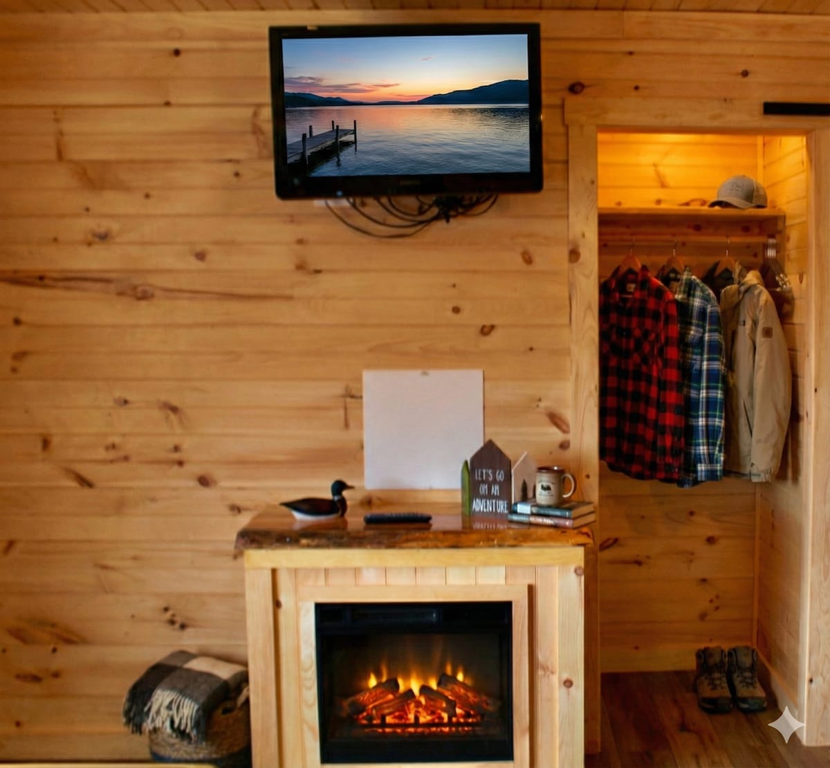 Pamostieties līdz elpu aizraujošam saullēktam pār Džordža ezeru no sava privātā balkona. Izbaudiet izcilu atpūtu ar privātu burbuļvannu, kas aprīkota ar plīša peldmēteļiem. Izbaudiet romantiskus vakarus ar pēc pasūtījuma būvētu bāru (BYOB), virtuvi un ar rokām darinātām guļbaļķu mēbelēm, radot nevainojamu Adirondakas noskaņu. Atklājiet mūsu smilšu pludmali, grilus un ugunskura vietas mirkļus prom no jūsu durvīm. Izbaudiet bezmaksas kajakus, airu dēļus, kanoe un airu laivu neaizmirstamiem piedzīvojumiem ezerā. Jūsu romantiskā atpūta jau gaida!