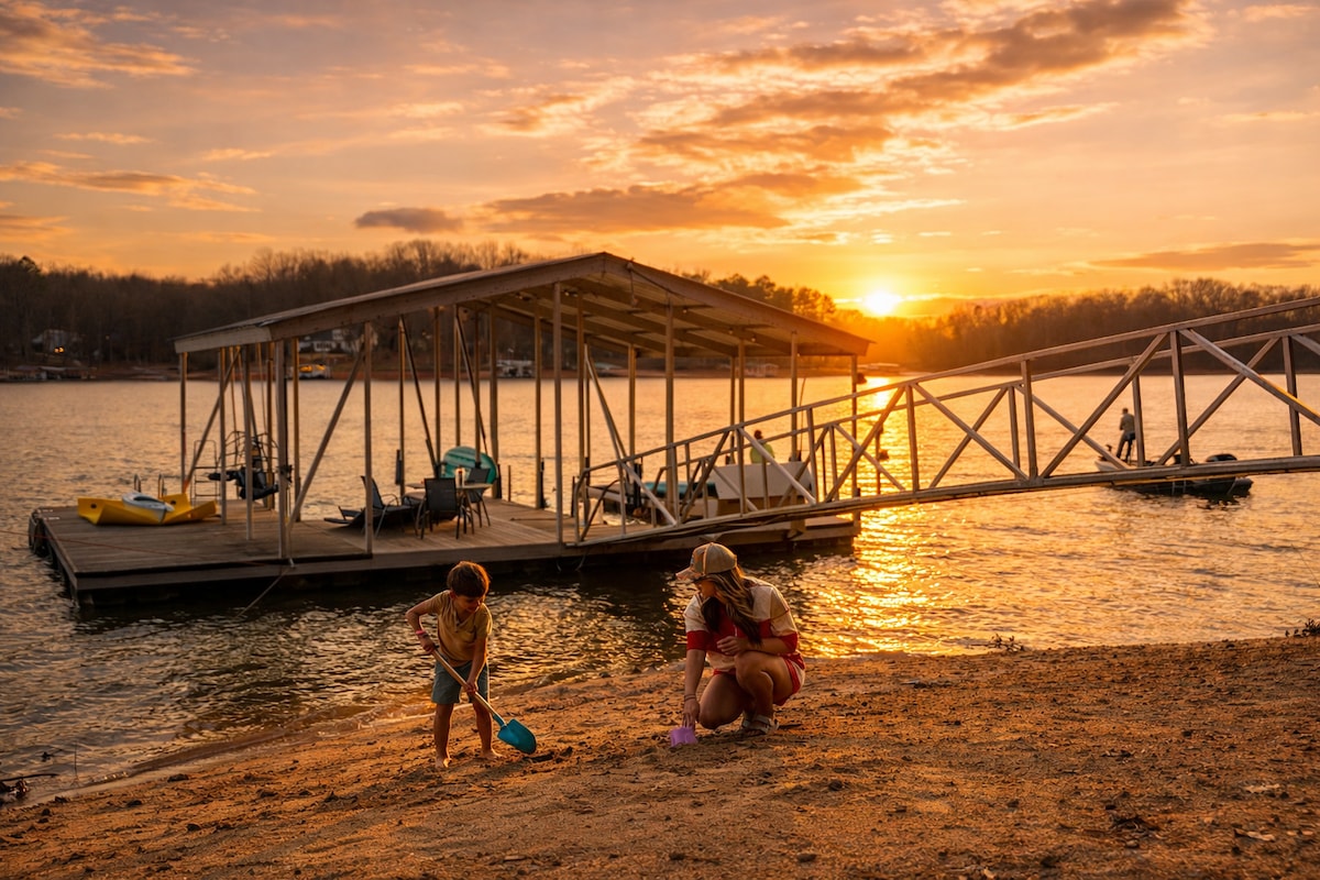 Pulcējiet ģimeni vai draugus neaizmirstamai atpūtai pie ezera plašā, ar papildērtībām piepildītā mājā pie ezera īpaši privātā vidē. Jūsu grupa lieliski pavadīs laiku piestātnē, izmantojot kajakus un airu dēļus, makšķerēšanu, peldēšanu un daudz ko citu. Ņemiet līdzi vai iznomājiet laivu. Atpūtieties pie ezera aizsegtā verandā un vairākās iekštelpu/āra pulcēšanās vietās. Bērniem un pieaugušajiem patiks skatīties filmas un spēlēt futbola bumbu spēļu istabā. Radiet atmiņas par pludmales vai akmens ugunskura vietas izvēli.