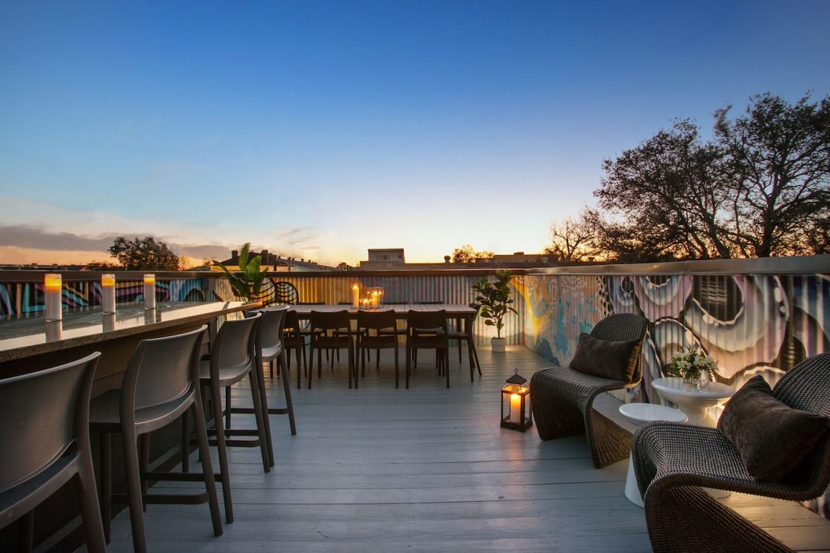 Šis īpašais privātais mājoklis piedāvā luksusa piedzīvojumu kā neviens cits. Pirmajā līmenī ir plaša virtuve, kā arī 12 pēdu augsta bīdāma stikla siena ar piekļuvi balkonam, no kura paveras skats uz draudzīgu un dinamisku apkaimi. Atpūtieties uz privāta jumta terases ar ekskluzīvu burbuļvannu un iespaidīgu skatu uz pilsētas centru un apkārtni no 30 pēdu augstuma. Mid-City ir brīnišķīga, pastaigām piemērota apkaime, kas atrodas centrā, lai piekļūtu visam, ko piedāvā Ņūorleāna.