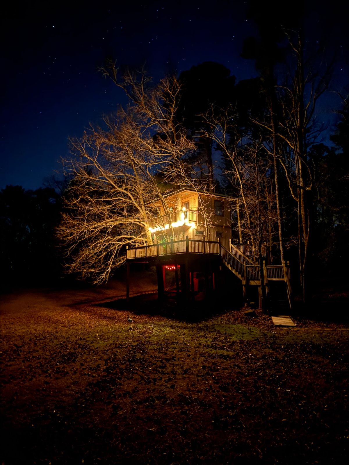 The TinyBarn at Covenant Woodlands is a lofted 350 sq ft glamping cottage in the piney woods of AL. Made with love from locally reclaimed upcycled materials. Equipped with modern appliances that fit the nostalgic cabin vibe: an electric wood burning stove and red retro kitchen appliances complimented by bear & moose accent decor. It’s cozy, but with everything you need for a getaway. Outside you’ll find rockers, a fire pit/outdoor dining area plus a hammock and bench. Insta: @CWglampingInAL