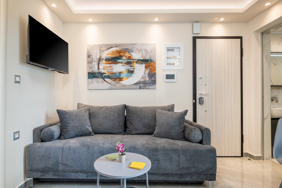 Atklājiet pavisam jauno Diamante Del Mar Phaedra skaistajā Kosas salā, kas atrodas 200 m attālumā no Lambi pludmales. Šajā modernajā mājoklī ir plaša guļamistaba un pilnībā aprīkota dzīvojamā istaba-virtuve, kas veidota no mīkstiem pelēkiem toņiem elegantai atmosfērai. Izbaudiet ērtu dīvānu un divus televizorus atpūtas brīžiem. Ar lielisku skatu un visām ērtībām, piemēram, īpaši ātru Wi-Fi internetu, viedtelevīziju, diviem gaisa kondicionētājiem, garantē neaizmirstamu uzturēšanos.