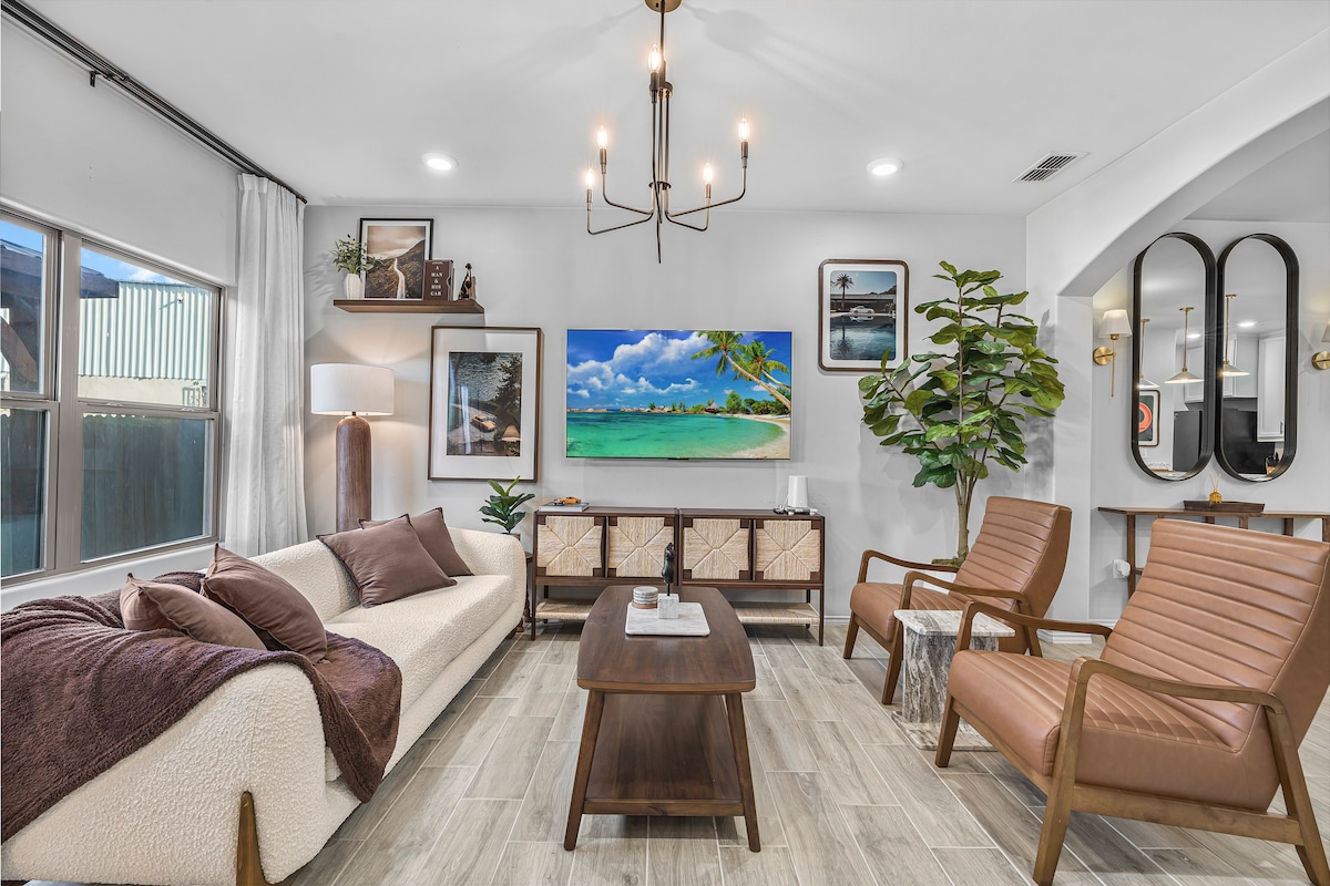 Lieliskā mājas atrašanās vieta dažu kvartālu attālumā no tirdzniecības centra ļauj visai grupai vai ģimenei izbaudīt uzturēšanos pilnībā pārbūvētajā mājoklī, tā lielā virtuve ar kvarca darba virsmām nodrošina ideālu vidi ēdiena gatavošanai visai ģimenei. 3 plašās istabās ir īpaši ērti viskoelastīgi matrači, kā arī papildu dīvāngulta. Istaba ir plaša un ērta, tajā ir 55 collu viedais HDTV, ēdamistabas zona un ēdamistaba, kurā var uzņemt līdz 12 cilvēkiem.