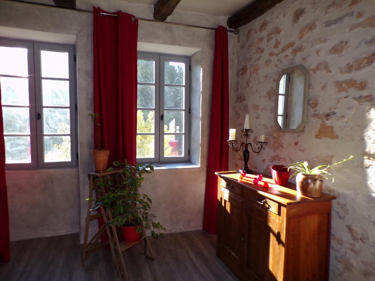 Burvīga neliela savrupmāja, tostarp 1 liela viesistaba ar dīvāngultu, 1 pilnībā aprīkota virtuve ar bāru, cepeškrāsni, trauku mazgājamo mašīnu, saldētavu, mikroviļņu krāsni, 1 mezonīna guļamistaba, kas atvērta dzīvojamajai istabai ar 1 gultu 160, 1 dušas telpa ar dušu un tualeti. Plakanā ekrāna televizors, DVD atskaņotājs, Hi-Fi sistēma, galda spēles, grāmatas, CD, DVD, veļas mašīna. WiFi mežaina zeme. Klusa un bukoliska vide... Skaista terase ar grilu, dārza mēbelēm. Gulta izgatavota pēc ierašanās.
