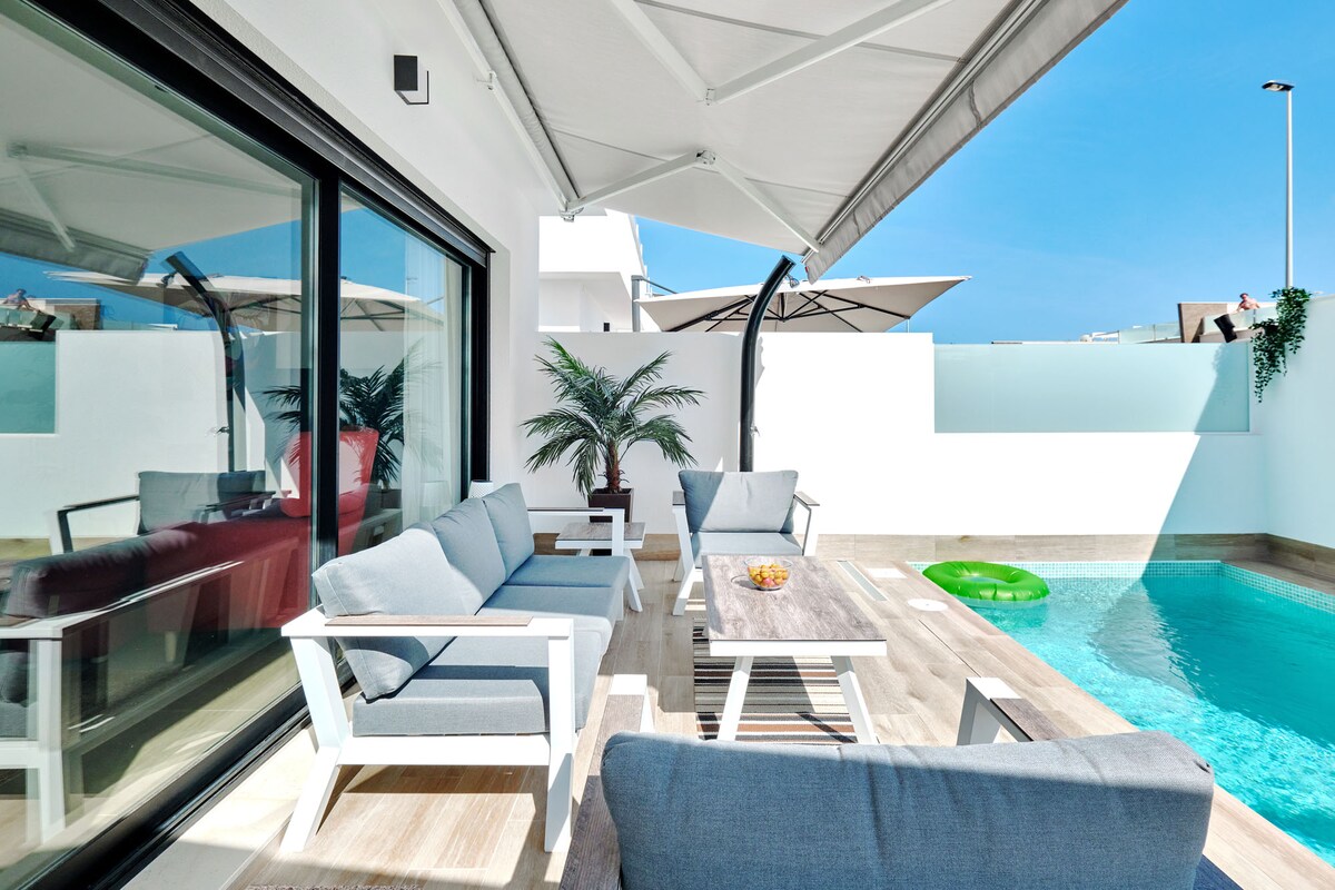 VV-MU.4384-1 Piękna willa w San Pedro de Pinatar. Elegants, pilnībā aprīkots, pievēršot uzmanību detaļām. 3 guļamistabas, 2 vannasistabas, liela dzīvojamā istaba ar atvērtu virtuvi. Vasaras virtuve uz jumta ar segtu vietu, kur ieturēt maltīti. Privāts apsildāms baseins un jumta burbuļvanna. Ideāla greznības un atpūtas oāze. Attālums no Playa la Puntica aptuveni 1.2km Tuvākais lielveikals apmēram 350 m Restorāni aptuveni 300 m attālumā