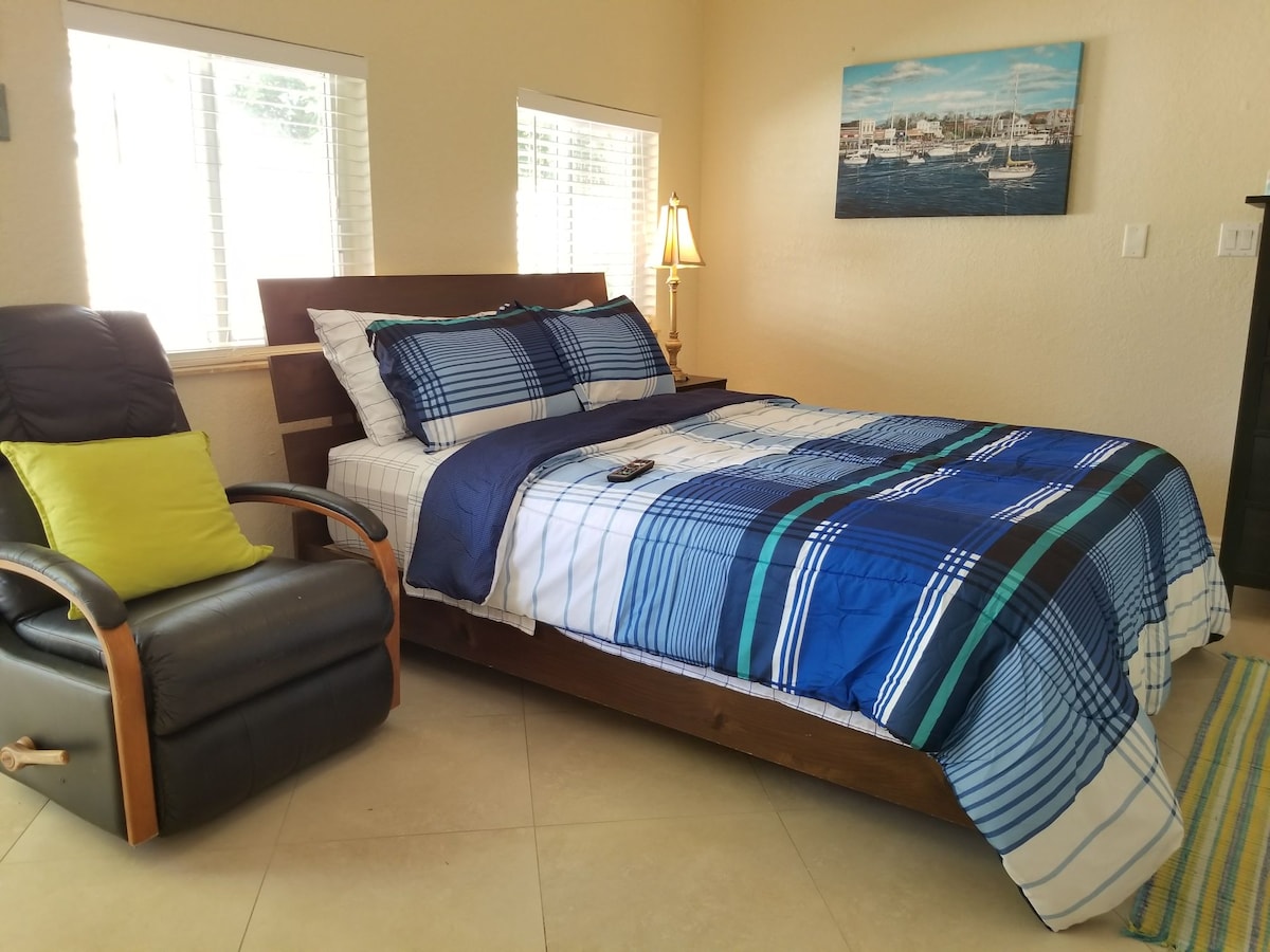 Grezna privāta studija ar privātu ieeju (440 kvadrātpēdas var uzņemt 3 cilvēkus/2 automašīnas) ir pievienota mūsu mājoklim un 1,7 jūdžu attālumā no pludmales un blakus Ft Lauderdale. Novietojiet automašīnu zem segtās nojumes. 1 divguļamā gulta (& 1 Queen Size-Blow Up matracis), 1 vanna, virtuvīte, optiskās šķiedras Wi-Fi, plakanā ekrāna televizors (140 kanāli), trieciena logi, milzīgs skapis, ventilators/gaisma, maiņstrāva ar tālvadības pulti, rakstāmgalds, krēsls, nolokāms/nolaižams galds ēšanai ar krēsliem, neliels ledusskapis, mikroviļņu krāsns, tostera cepeškrāsns, meistara grils, karstā šķīvju plīts, kafijas automāts.