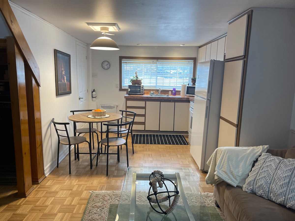 Mājīga neliela studija zem zemes vienam vai diviem viesiem. Atrodas klusā, labi savienotā vietā, tikai 3-5 minūšu gājiena attālumā no Cartier metro (oranžā līnija) ar tiešu piekļuvi Monreālas centram 20-25 minūšu laikā. Monreālas-Trudeau lidosta (YUL) atrodas 25-30 minūšu brauciena attālumā ar automašīnu. Ietver Wi-Fi, pilnībā aprīkotu virtuvi, privātu vannasistabu, veļas mazgājamo mašīnu/žāvētāju un Smart TV. Ideāli piemērots ceļotājiem, kuri meklē komfortu un ērtu tranzītu. Sertifikāts CITQ Nr. 304968.