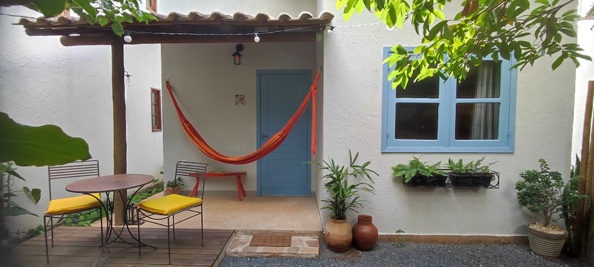 Ideal para uma estadia de uma semana ou mais pois o desconto é vantajoso ( 50% para 1 mês). Você despertará ouvindo o canto dos pássaros e repousará em varanda com rede desfrutando a vista para o quintal de 2000m com árvores frutíferas. Uma escrivaninha auxiliar pode ser adicionada. Ventilador de mesa e de parede. Móveis exclusivos feitos pelo proprietário. O casal anfitrião mora em uma casinha nos fundos da propriedade . Acolhemos e respeitamos todas as raças, religiões e gêneros.