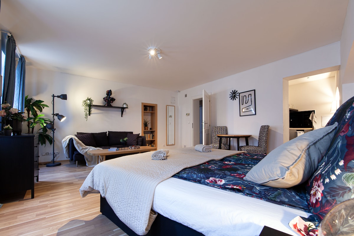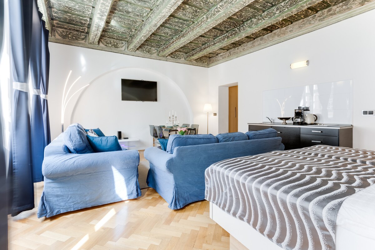Pamostieties no baznīcu zvanu skaņas un pastkartes skata uz Prāgas jumtiem. Šī mājīgā studija atrodas tikai dažu soļu attālumā no Kārļa tilta, Mostecká ielā – 750 gadus vecas bruģētas joslas, kas kādreiz bija daļa no Karaliskā ceļa, ko Bohēmijas karaļi aizveda uz Prāgas pili. Izbaudiet rīta kafiju un kruasānu ar skatu uz pili no kopīgā balkona un izpētiet Mazpilsētas burvību kājām. Patiesi romantisks mājoklis pāriem, vienatnē dzīvojošiem piedzīvojumu meklētājiem un sapņotājiem.