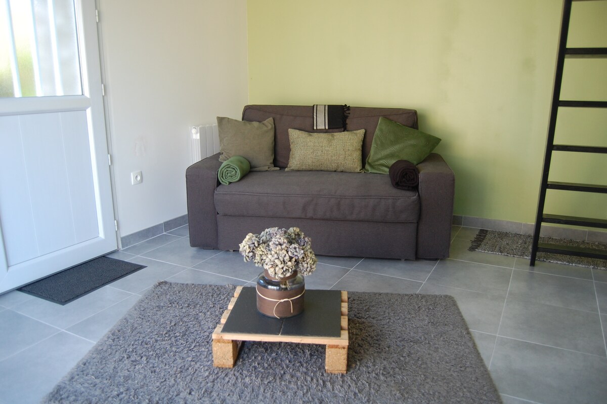 Laipni lūdzam šajā mūra mājā netālu no upes (la Sarthe). Māja sastāv no viesistabas 22 m2 platībā ar aprīkotu virtuvīti, aprīkotu atpūtas telpu /dzīvojamo zonu, 1 guļamistabu un vannasistabu ar dušu un tualeti. Terase ar skatu uz Sarthe - Viesistaba 22 m2 platībā (Dīvāngulta 140 x 190) - Guļamistaba Nr.1 no 8 m2(2 vienguļamās gultas 90x190). - Vannasistaba ar dušu 5 m2 + WC Suņi un kaķi nav atļauti