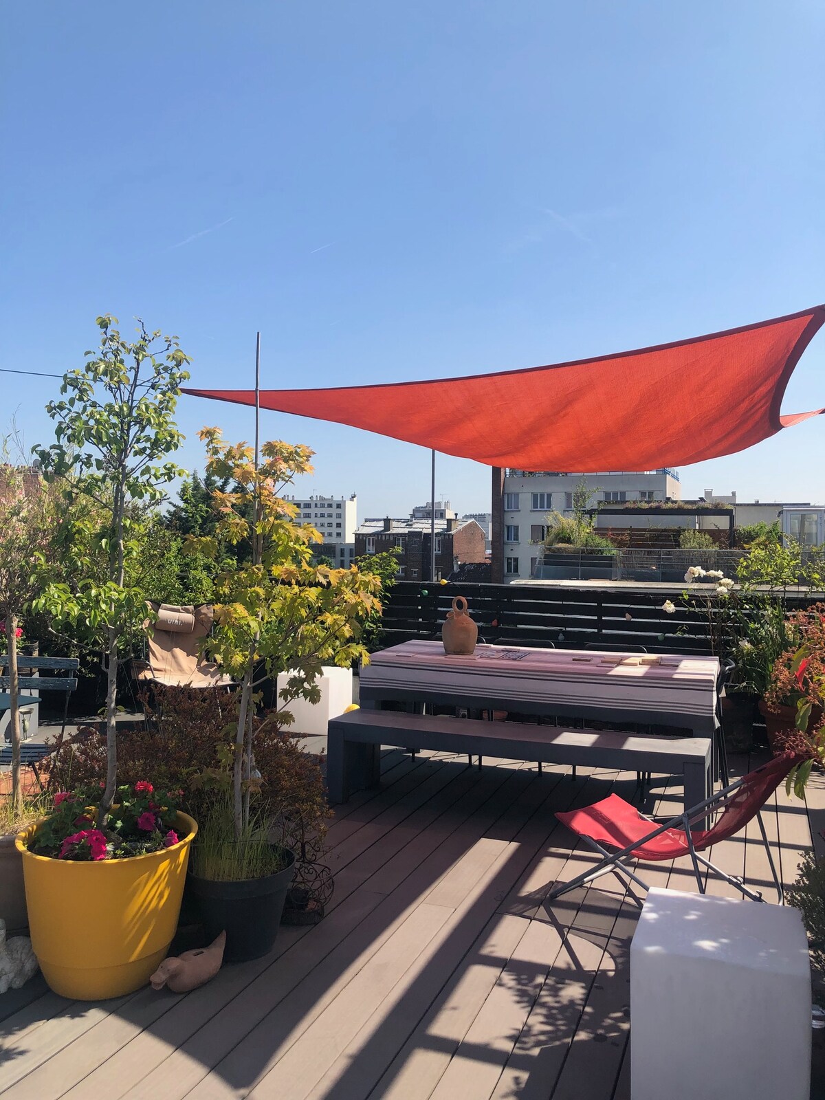 Ce logement affiche un style résolument unique avec sa terrasse verdoyante plein sud et son balcon au nord avec vue panoramique situé au dernier étage de la résidence. La chambre propose une literie haut de gamme et modulable, pouvant être préparée en lit Queen size ou en 2 lits séparés. Situé à 5 mn à pieds de la station de métro Romainville -Carnot, la ligne 11 dessert le centre de Paris en 18 mn ( Chatelet, Hôtel de ville, République). Aux pieds de l'immeuble de nombreux commerces.