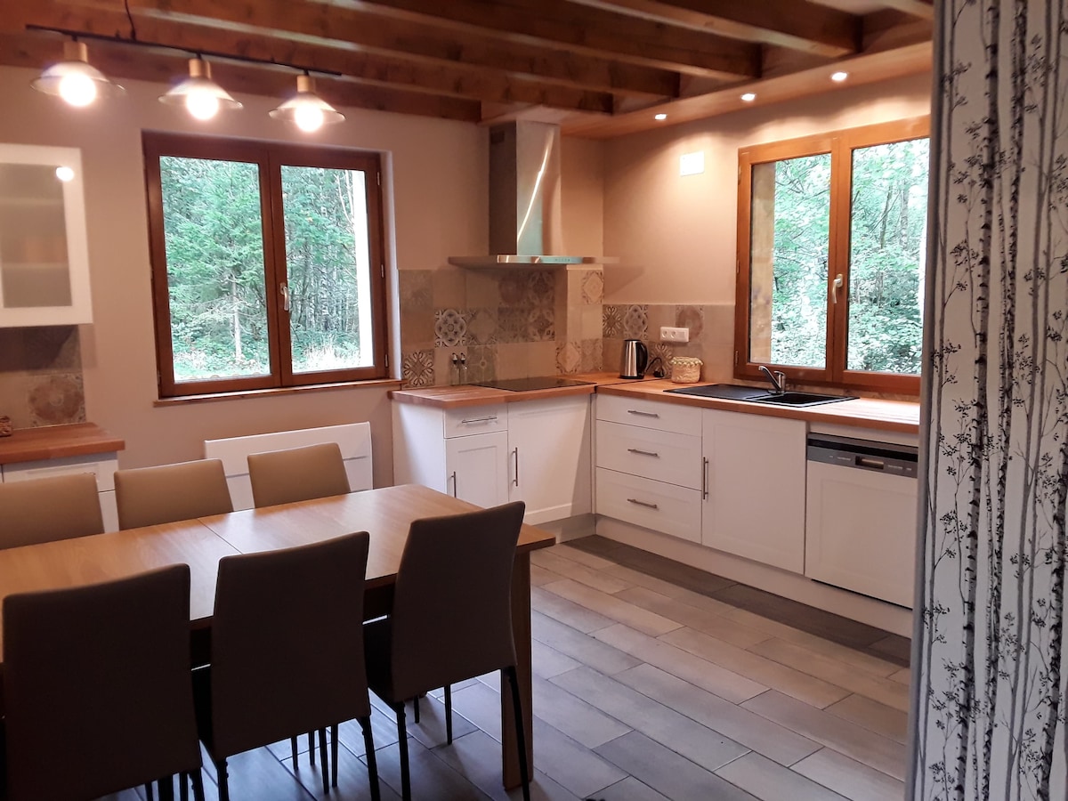 Jauka 80 m2 kotedža pirmajā stāvā un 20 m2 pirmajā stāvā, guļ 6 pieaugušie: - Trīs guļamistabas aprīkotas ar divguļamajām gultām - Dzīvojamā istaba ar dīvāngultu - Mezonīns ar bērnu gultiņu Uzturēšanās laikā jūs varēsiet pagatavot labas picas, pateicoties mūsu āra krāsnij ar malkas uguni. Izbaudiet arī mūsu terasi, no kuras paveras skats uz mežu. Daudzas pastaigas mežā jūs gaida pa mūsu slaveno kalnu "dvīņu" takām.