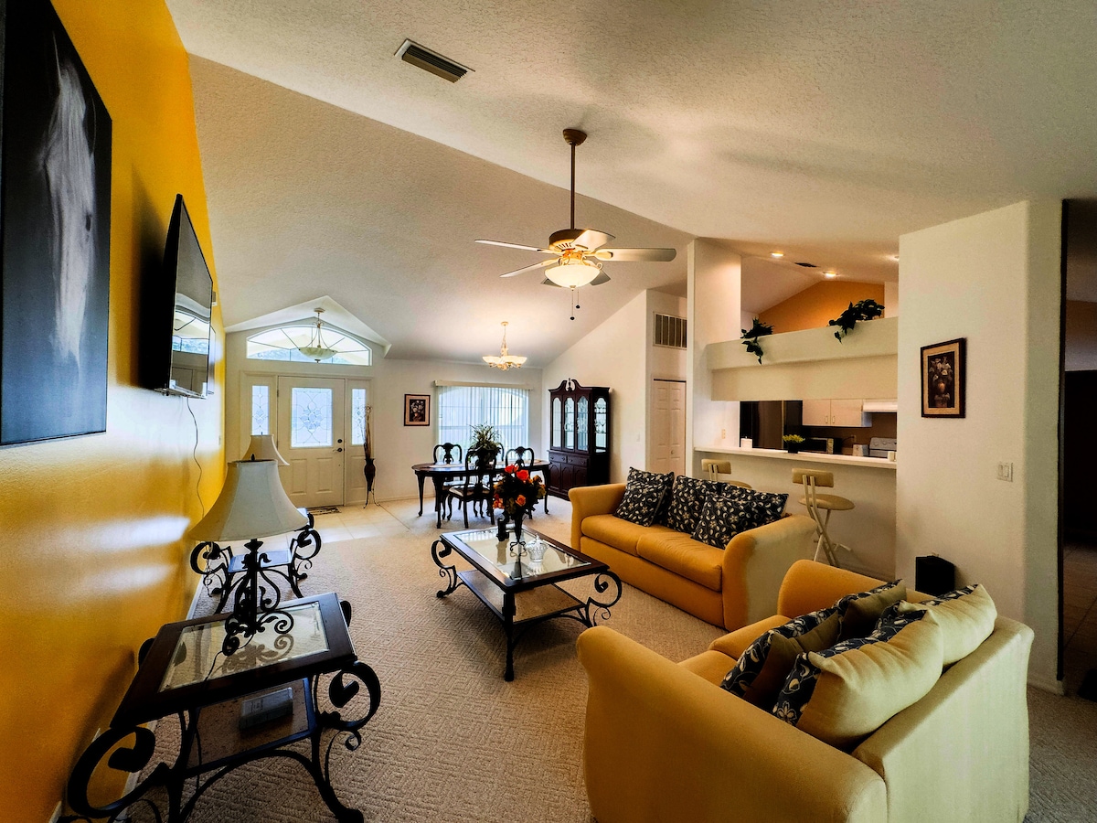 Atpūtieties kopā ar visu ģimeni šajā mierīgajā 3 guļamistabu, 2 vannu mājoklī netālu no Varavīksnes pavasara pavasara parka, Pasaules Jāšanas sporta centra, HITIEM, Disneja, pludmalēm un avotiem. Tas ir ideāli piemērots līdz 6 viesiem. Trīs guļamistabas ar plīša gultām un aptumšojošiem aizkariem, lai jūs varētu gulēt un pamosties pilnībā atpūties. Pilnībā aprīkota virtuve ar visu nepieciešamo ēdiena gatavošanai. Jaukas 3 āra atpūtas zonas saulrieta baudīšanai. Tas ir lieliski piemērots, lai jūs varētu atpūsties un atslēgties no ikdienas.