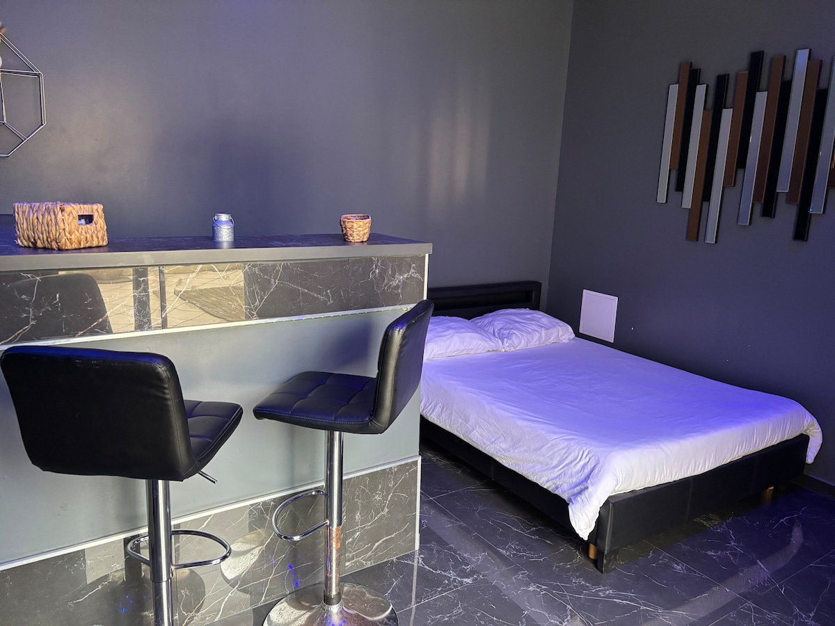 Venez profiter d’un moment en couple ou entre amis dans cette superbe suite avec jacuzzi privatif. La suite dispose de tout le nécessaire pour un séjour agréable : • kitchenette : vaisselle, mini frigo , micro-ondes et machine à café • Lit king size avec matelas Emma pour un confort optimal • Jacuzzi privatif avec rétroprojecteur • Douche à l’italienne effet marbre • TV écran plat avec IPTV Location possible à la nuitée, à la demi-journée ou à la journée complète à un tarif préférentiel