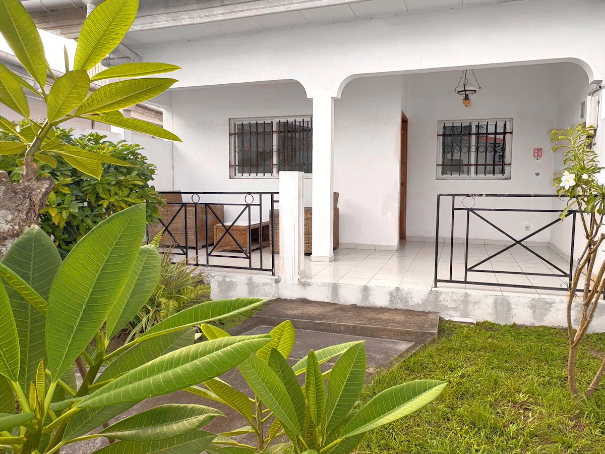 A 10 min de la plage, vous trouverez vos quartiers dans ce studio niché entre les arbres et les plantes. Situé a quelques mètres de la résidence du président de la république, c'est une résidence sécurisée et à proximité de super-marchés, patisseries etc. Refuge pour les oiseaux, vous aurez l'occasion de rencontrer des perroquets et toute sortes d'oiseaux. A l'écart des autres appartements de la résidence, ce studio est bordé par les plantes de toutes part.