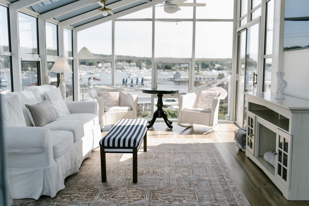Escape to our historic Greenleaf Inn! This renovated, second-floor King room offers stunning waterfront views of Boothbay Harbor. Perfect for 2 guests, it features a private en-suite bath and A/C. Enjoy shared spaces like a full kitchen, cozy living room, and a sky deck overlooking the water. Just steps from downtown shops and restaurants, it's the ideal coastal Maine getaway.