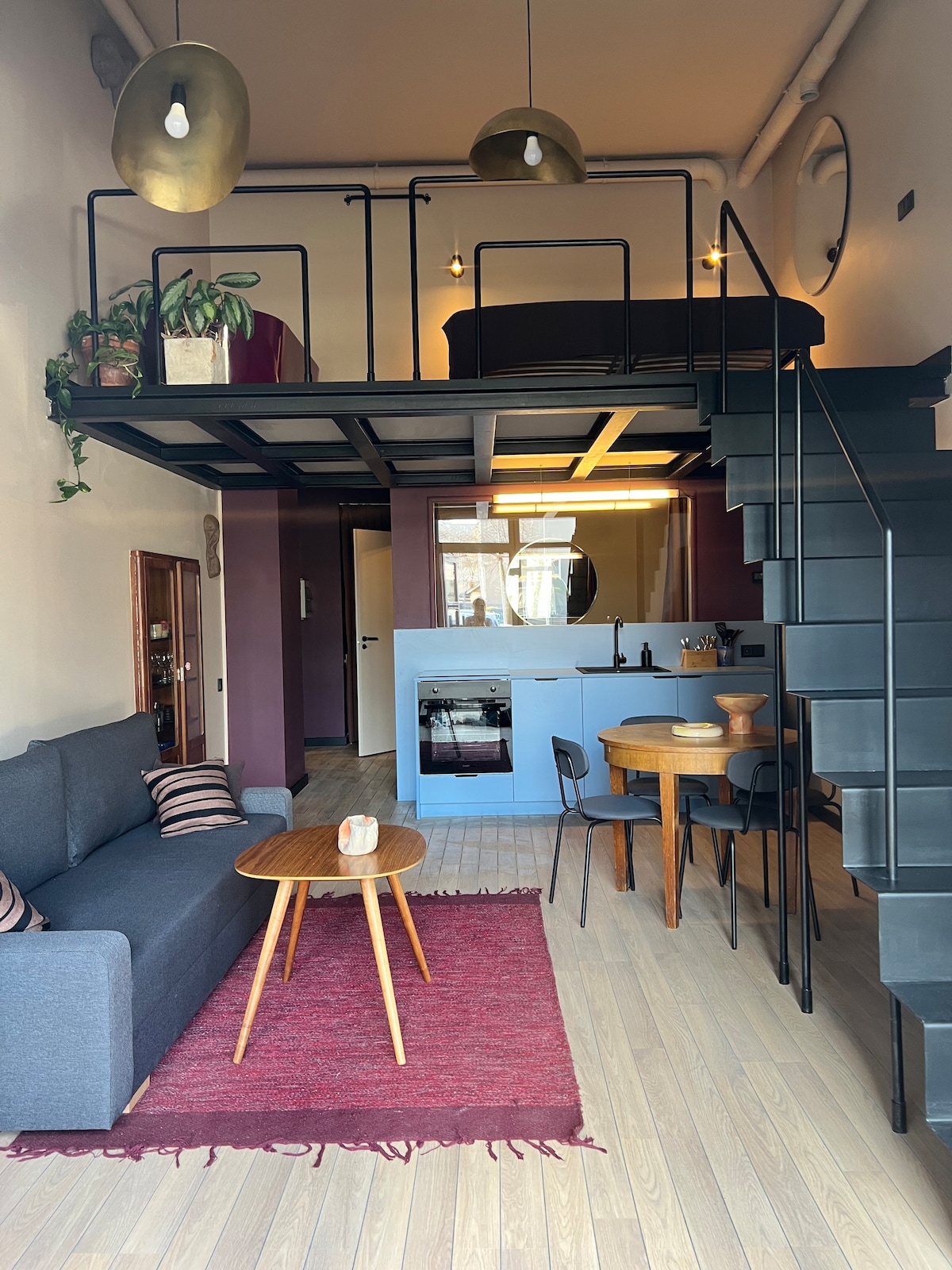 Stilīga divstāvu studija bijušā rūpnīcas ēkā (1949. gads), kas 2017. gadā tika pārveidota par mūsdienīgo “Radiolofts” kompleksu. Pārdomāti iekārtotajā apakšstāvā (20 m²) ir vannasistaba, pilnībā aprīkota virtuve un ēdamzona. Augšējais līmenis (10 m²) ir sadalīts guļamzonā un drēbju skapī. Lūdzu, ņemiet vērā: augšstāvam var piekļūt pa stāvām kāpnēm, un tas var nebūt piemērots viesiem ar ierobežotām pārvietošanās spējām vai bērniem.