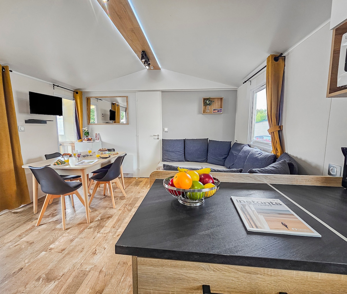 Rets piedzīvojums! Laipni lūdzam Blue Herons, plašajā, plašajā Beachcomber mobilajā mājā, kas ir ļoti labi aprīkota un ar siltu atmosfēru, kas ideāli atrodas uz vietas pie ūdens, gan klusā vietā, gan netālu no 4 zvaigžņu SIBLU kempinga infrastruktūras un rotaļu laukumiem. Ar lielo segto terasi atpūtai un maltītēm tā ir ideāla vieta ģimenes atvaļinājumam. Gultas, kas izgatavotas ierašanās laikā, un dvieļi, kas nodrošina uzturēšanos bez raizēm! Privāta autostāvvieta.