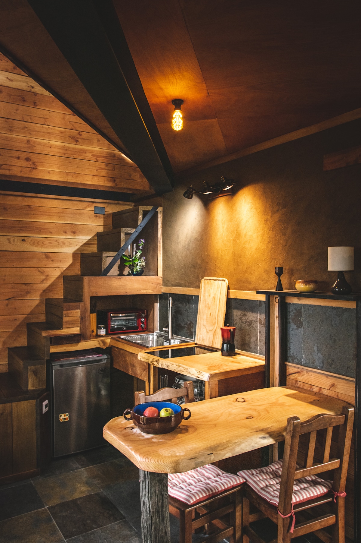 Nāciet un apskatiet mūsu moderno Apinas namiņu, kas veidots ar skatu uz Liucuras upi un atrodas skaistā vietējā mežā. Izbaudiet burvīgo upes un putnu skaņu. Tuvu labākajām tūrisma vietām: Ojos del Caburgua, Playa Blanca, slēpošanas centrs, karstie avoti, laivu braucieni, hidro Speed, izjādes ar zirgiem, Mirador de peces utt. Ja jums patīk piedzīvojumi, jūs būsiet sajūsmā. Vai, ja jūs meklējat mieru un vēlaties būt saskarē ar dabu, šī ir ideāla vieta... mēs ceram jūs redzēt!!